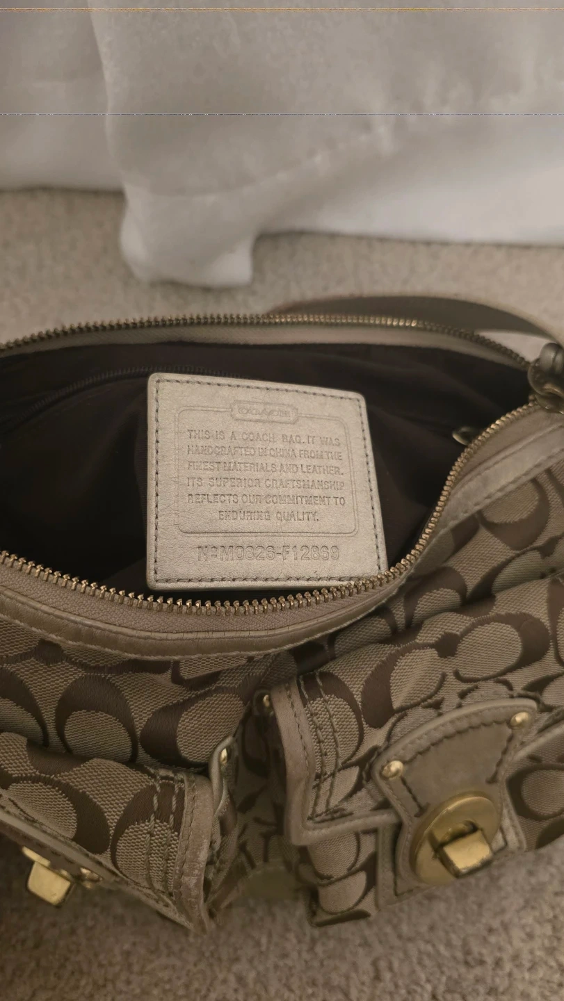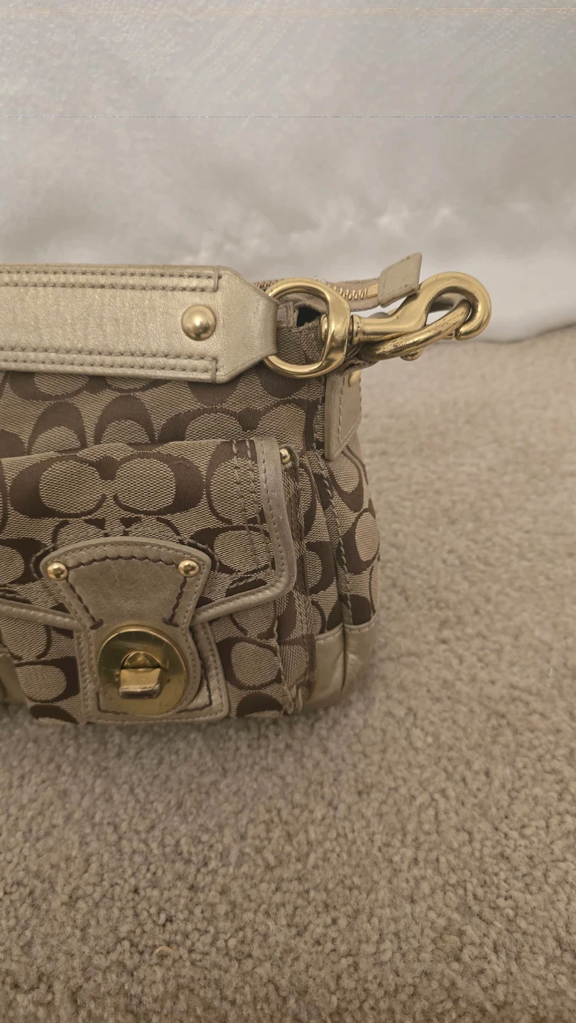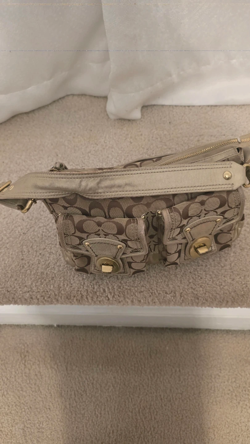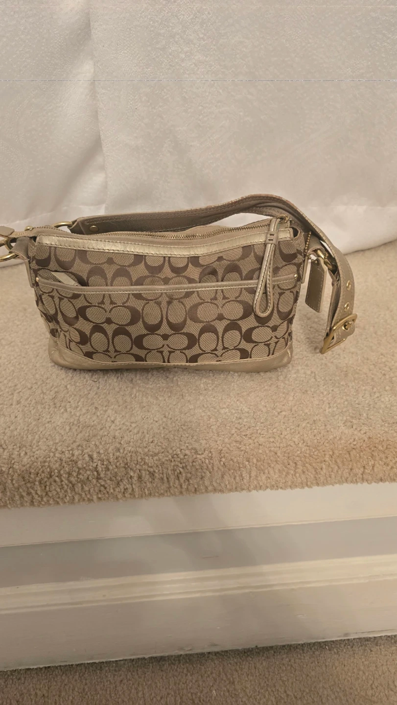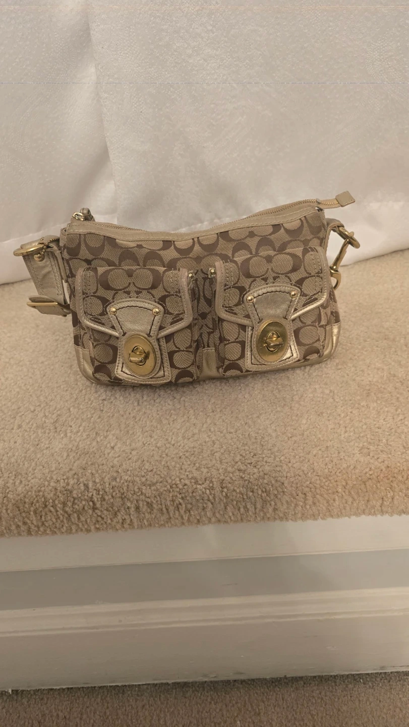 Selling a Coach Signature Hobo Bag in good condition! It features the classic Coach logo pattern with gold detailing. This bag is perfect for everyday use and has a stylish, compact design. It's a great addition to any wardrobe!
