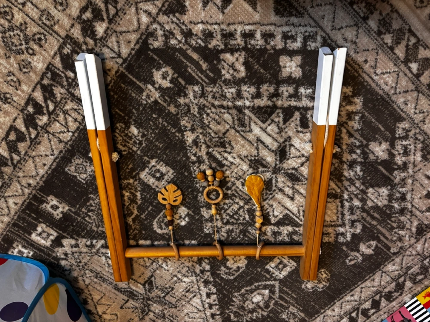 This is a wooden baby play gym. It features a natural wood finish with white accents on the legs. Three wooden toys hang from the top bar, including beads, a leaf shape, and a small spoon-like object. It's designed for babies to explore textures and shapes. You can add more hanging toys if you wish. I used this overtop of my baby while changing diapers to distract him.