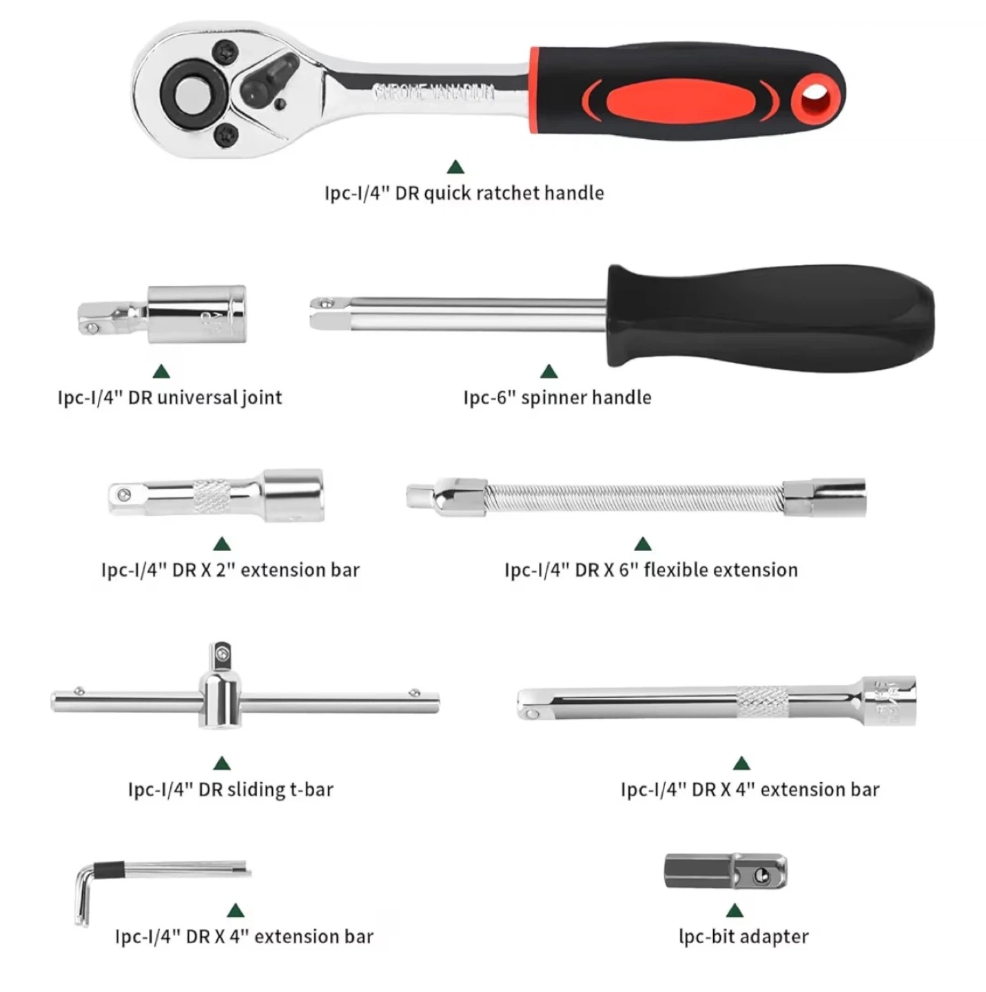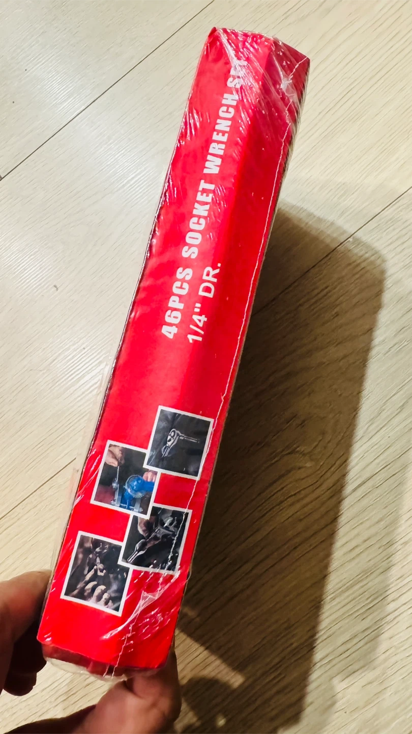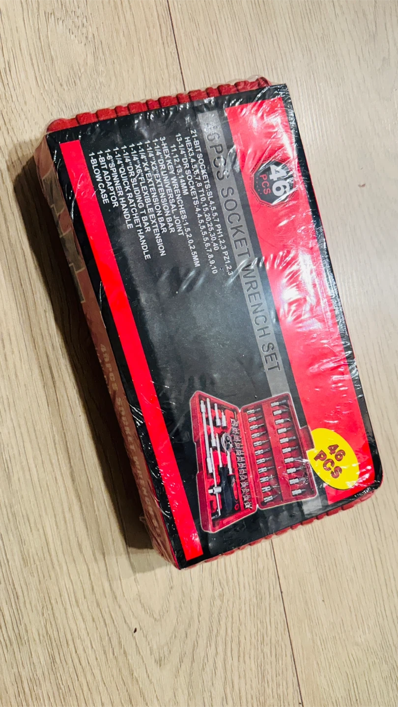 This 46-piece socket wrench set features a 1/4" drive with a quick ratchet handle. It includes various sockets, bits, extension bars, and adapters. This set is suitable for car repair, bicycle repair, and home repair tasks.