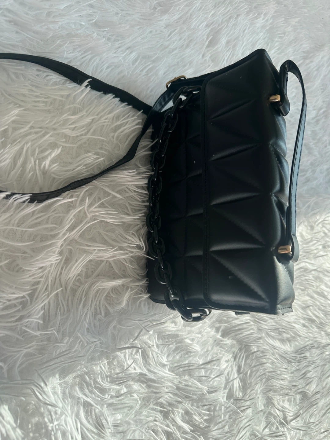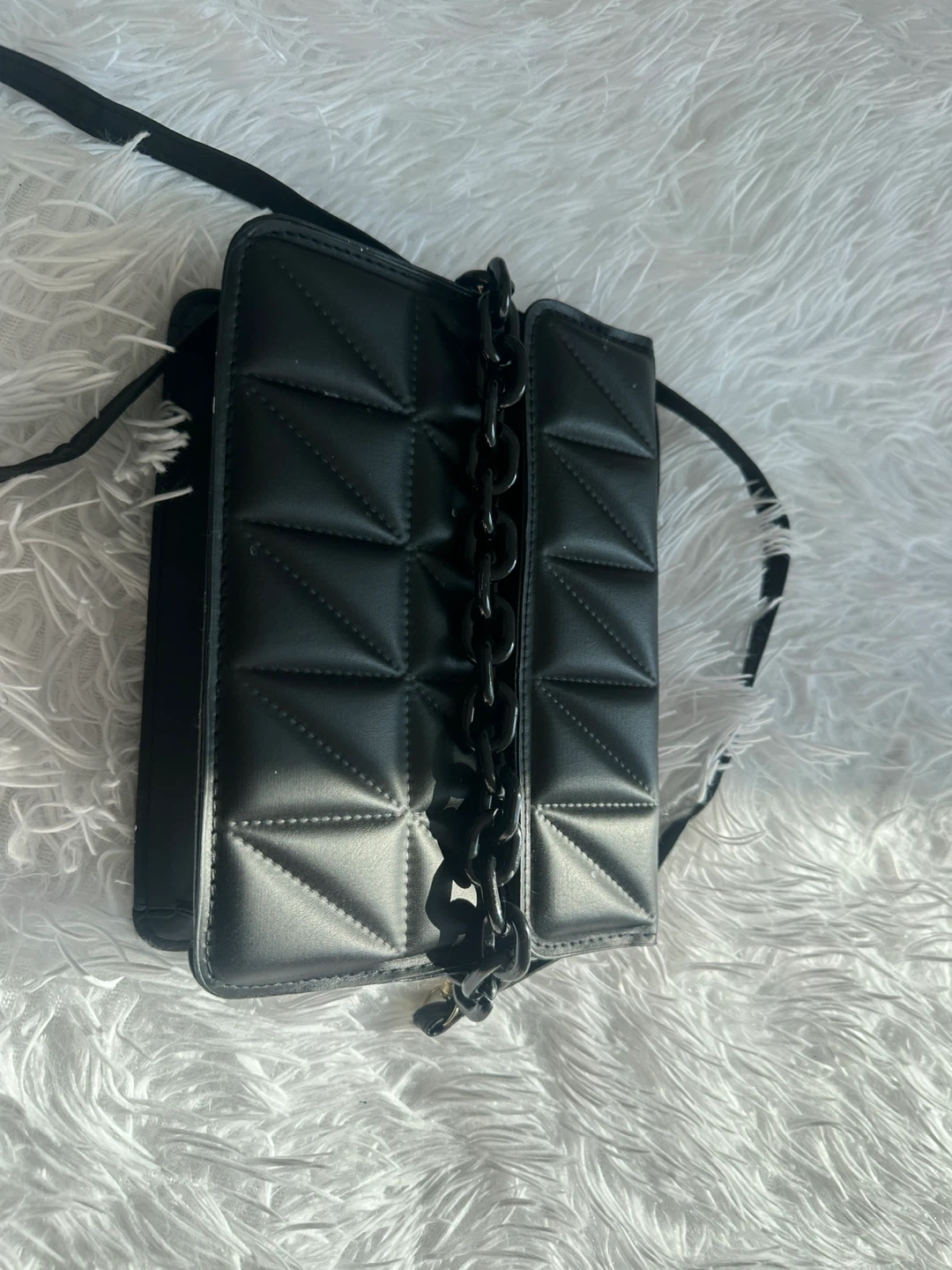 This stylish crossbody bag features a chic black quilted design with a bold black chain accent. It's perfect for carrying your essentials on the go. The faux leather material offers a sleek look and feel.