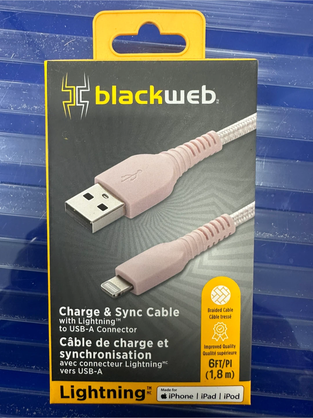 Selling a brand new Blackweb Charge & Sync Cable with Lightning to USB-A connector. It's 6 ft (1.8 m) long and features a braided cable for improved quality. Made for iPhone, iPad, and iPod. Comes in the original box!