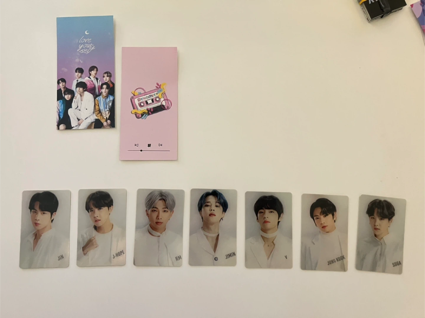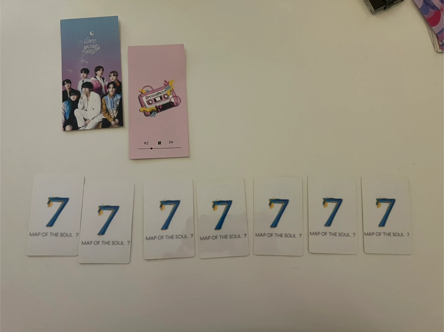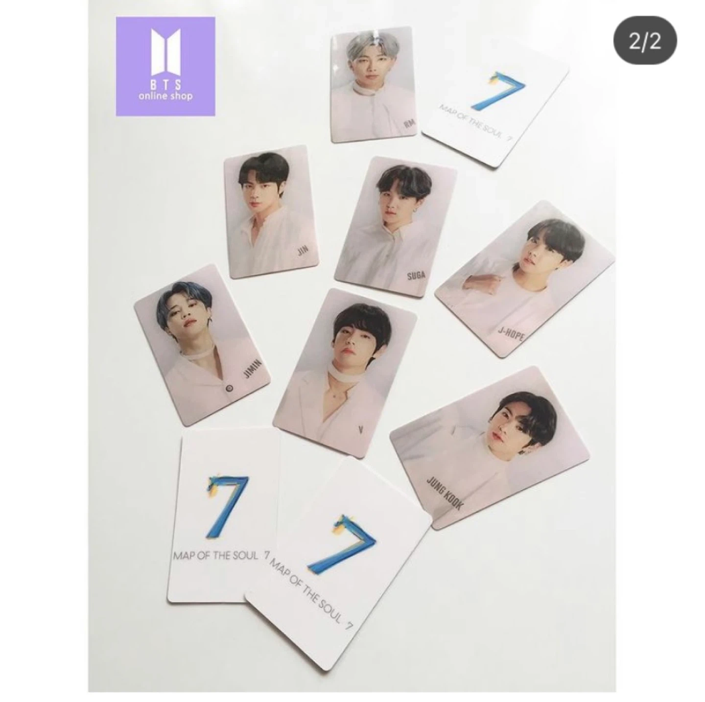 This set includes 7 photocards featuring members of BTS from the 'Map of the Soul: 7' era. The photocards are a great addition for any fan looking to collect memorabilia. Each card displays a member with their name clearly printed.