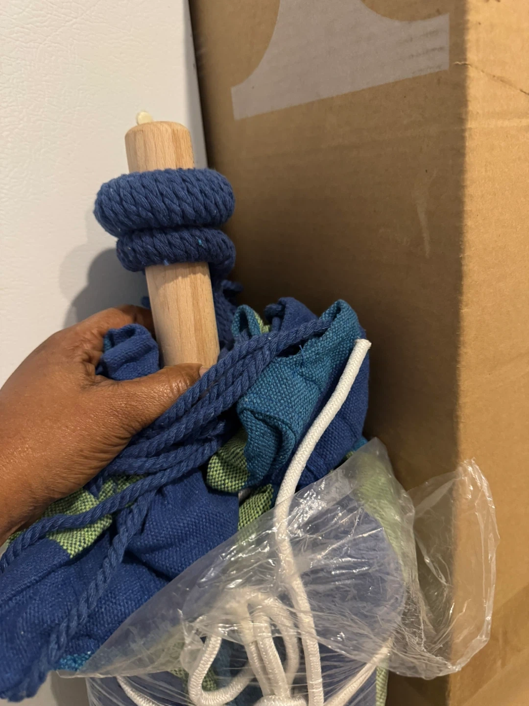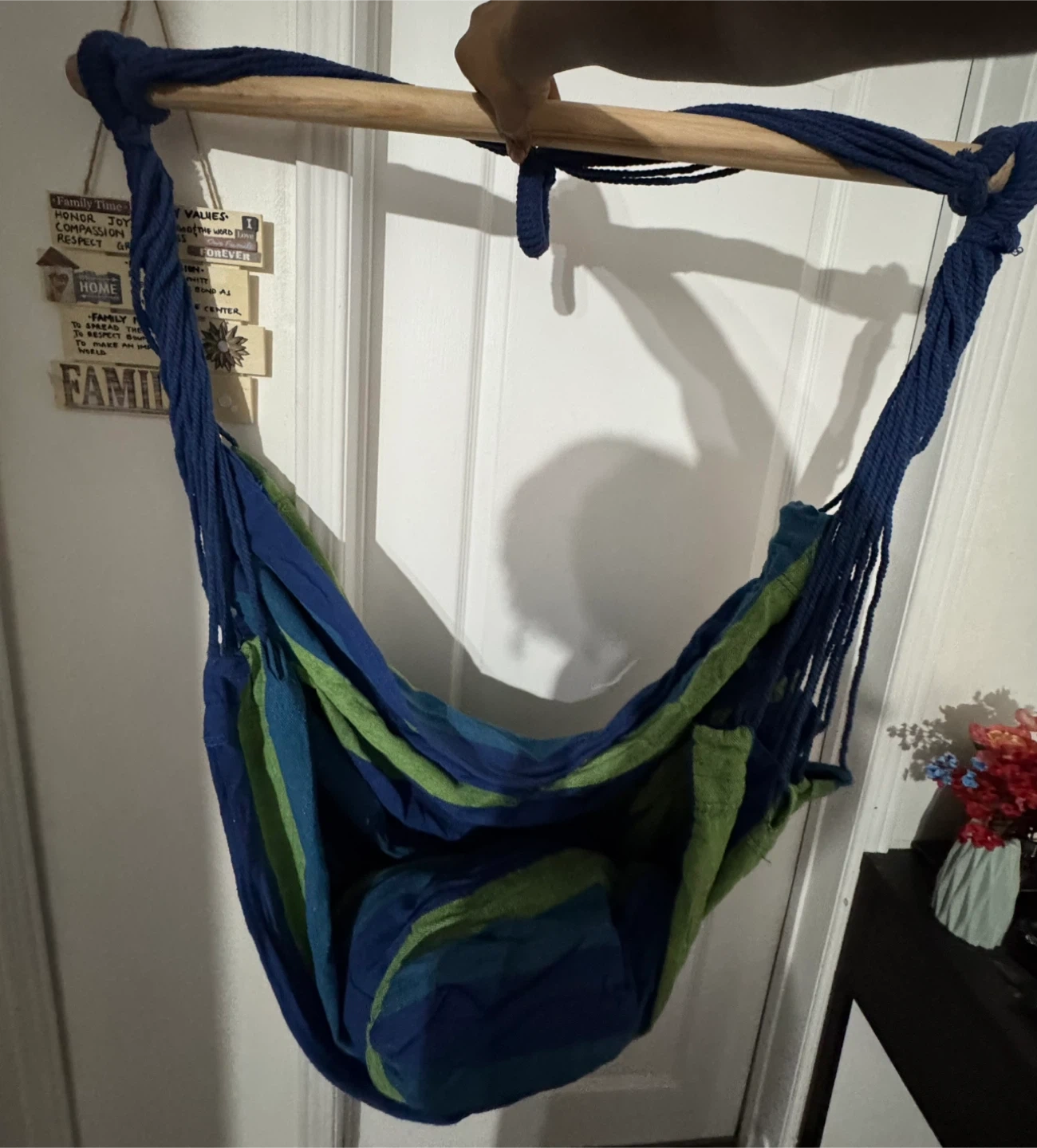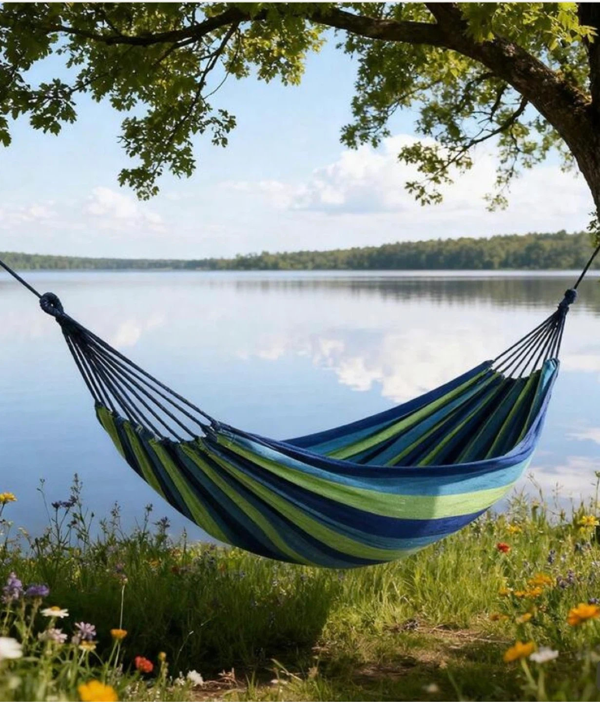 Relax in style with this hammock! The hammock features a vibrant blue, green, and white striped pattern. It's in great condition and ready for your backyard or patio.