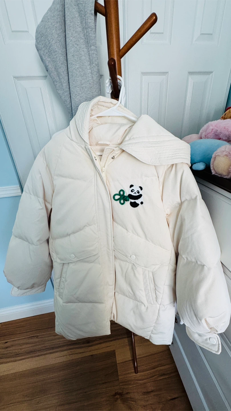 Cream-coloured puffer jacket featuring a cute embroidered panda. It's made with a corduroy outer shell and has a cozy hooded design. Perfect for keeping warm on cooler days!