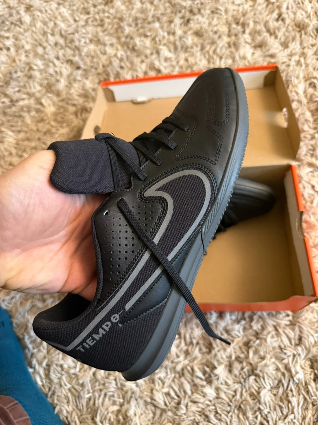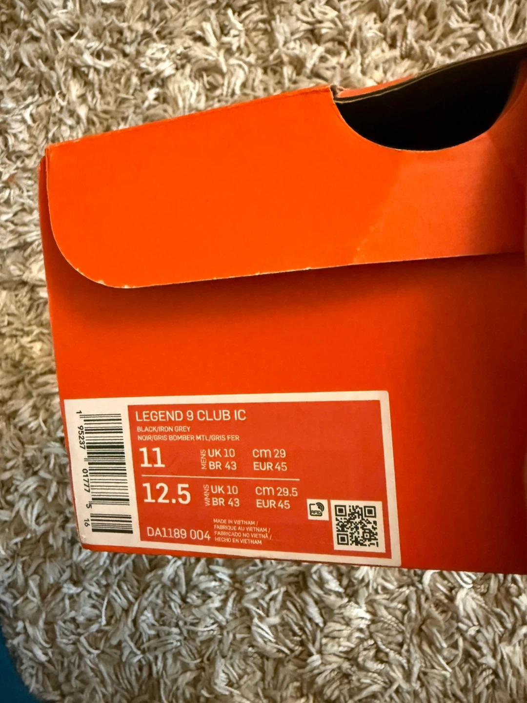 These are Nike Legend 9 Club IC indoor soccer shoes in black. Men's US size 12.5. Includes original box. Great for indoor soccer play!