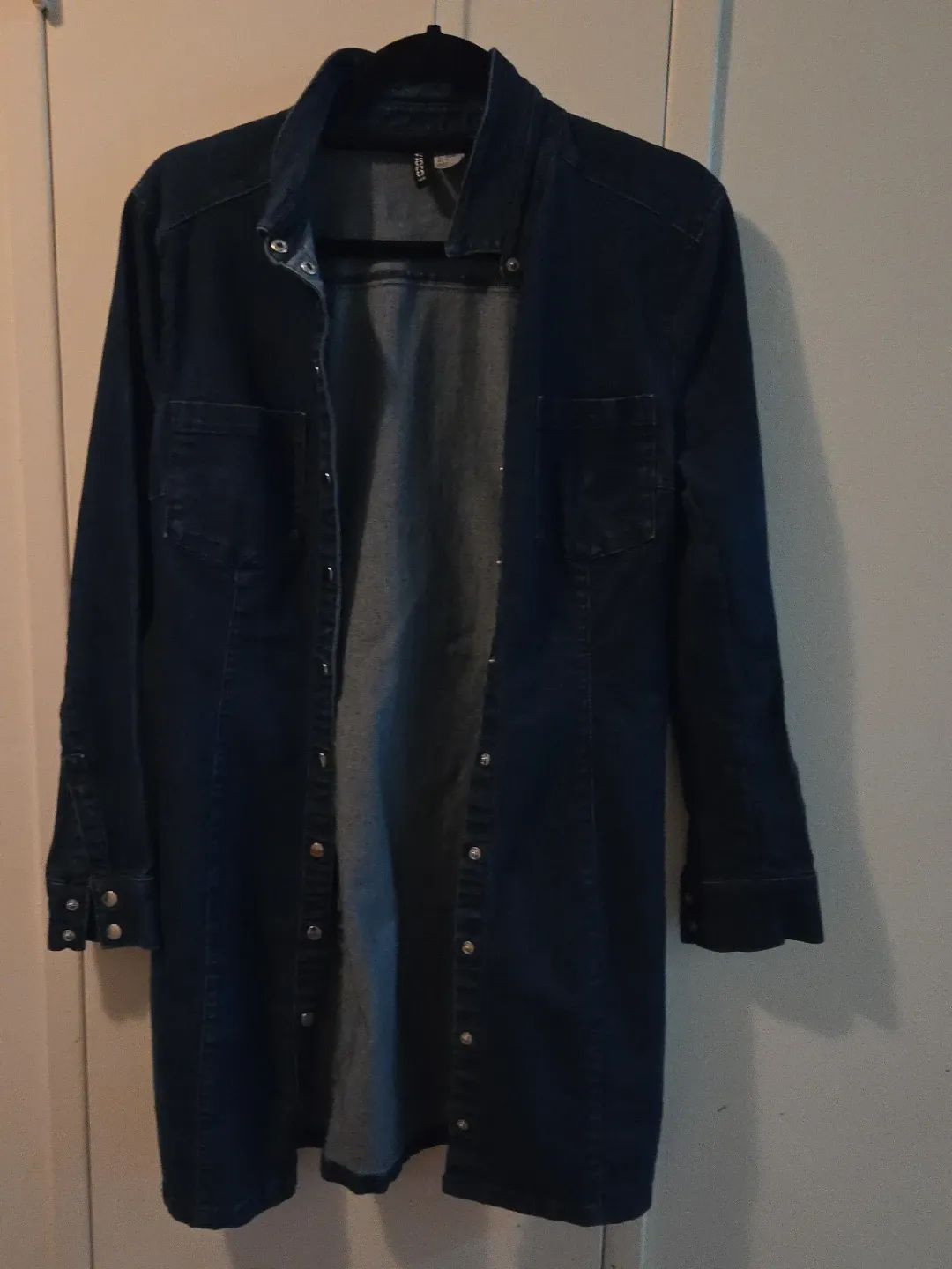 This is a long-sleeved denim shirt dress from H&M. It features a button-up front and two chest pockets. It's a versatile piece that can be worn as a dress or open as a duster.