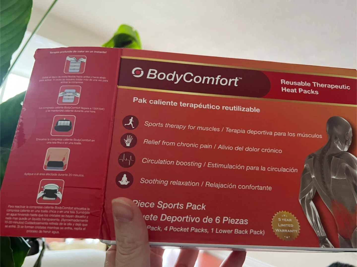 Selling a BodyComfort Reusable Therapeutic Heat Packs. This is a 6 Piece Sports Pack, which includes 1 Sport Pack, 4 Pocket Packs, and 1 Lower Back Pack. It provides sports therapy for muscles, relief from chronic pain, circulation boosting, and soothing relaxation. The pack has a 5-year limited warranty