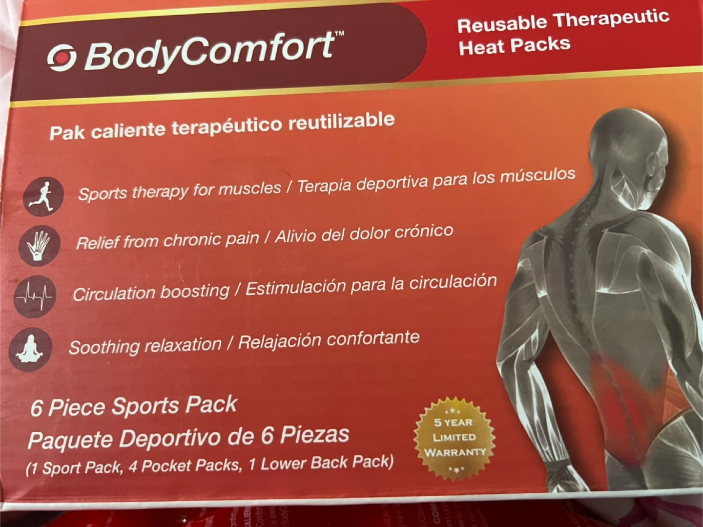 Selling a BodyComfort Reusable Therapeutic Heat Packs. This is a 6 Piece Sports Pack, which includes 1 Sport Pack, 4 Pocket Packs, and 1 Lower Back Pack. It provides sports therapy for muscles, relief from chronic pain, circulation boosting, and soothing relaxation. The pack has a 5-year limited warranty
