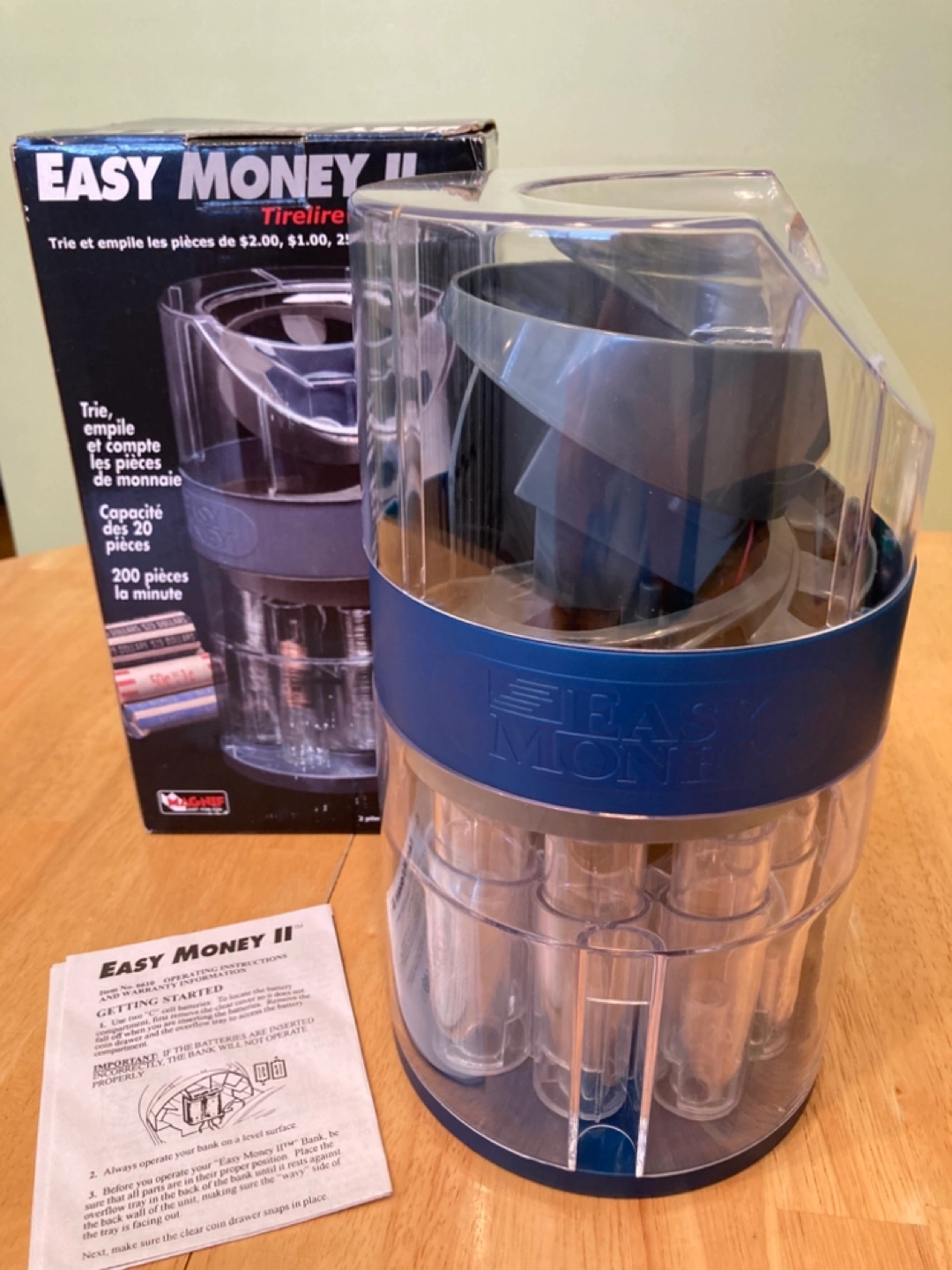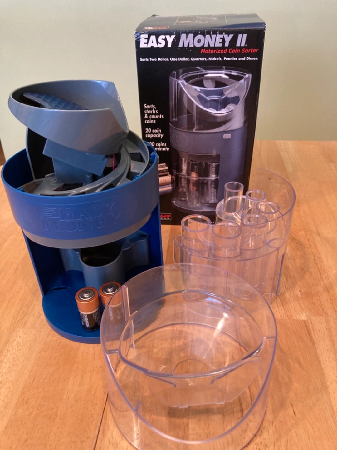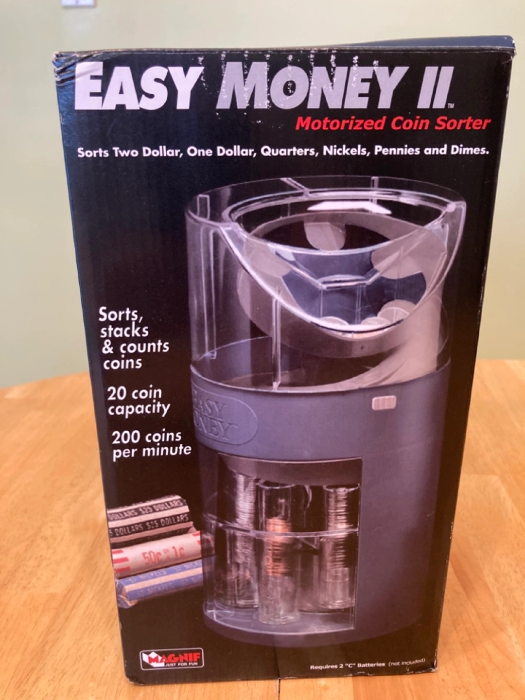 Motorized coin sorter and counter. Sorts and stacks for rolling. Good for all Canadian coins (Twonies, Loonies, Quarters, Dimes, Nickels, Pennies). Easy to use. Requires 2 “C” batteries.