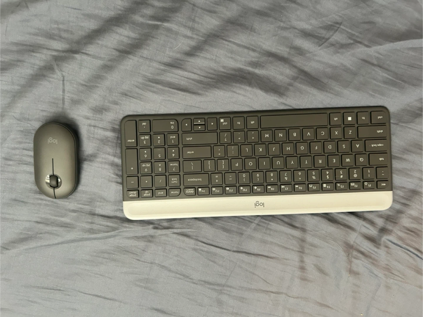 This is a Logitech wireless keyboard and mouse set. It's a dark grey colour with a white base on the keyboard. Includes the keyboard and a matching mouse.