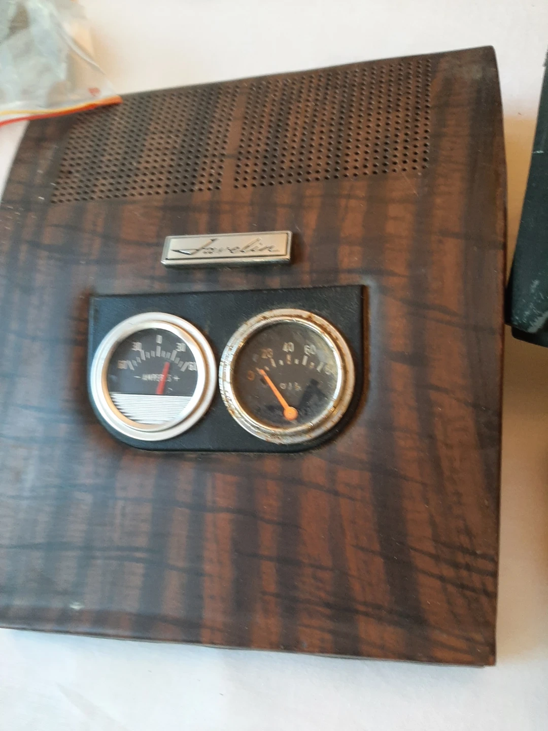 This is a vintage original gauge cluster assembly, identified with the 'Javelin' emblem. It includes a temperature gauge, oil gauge. For the 1969 343 sst javlin.