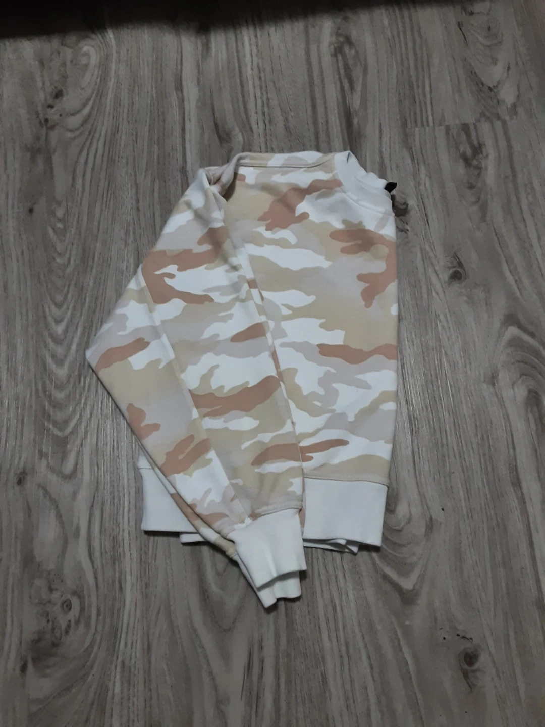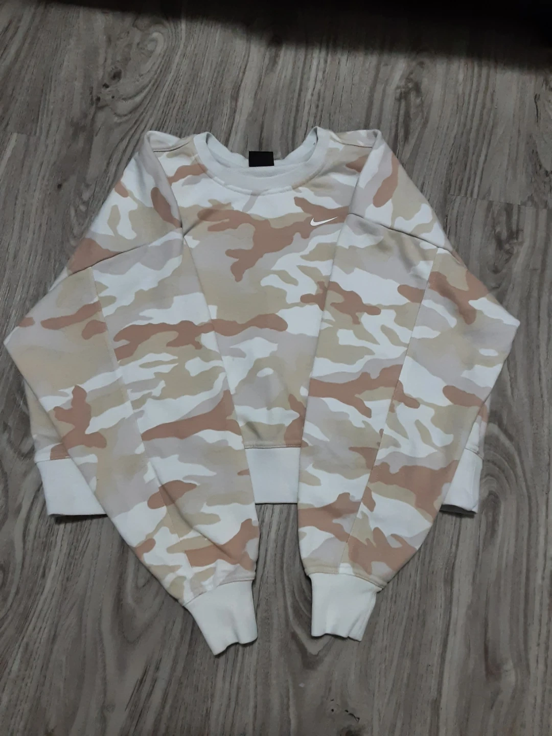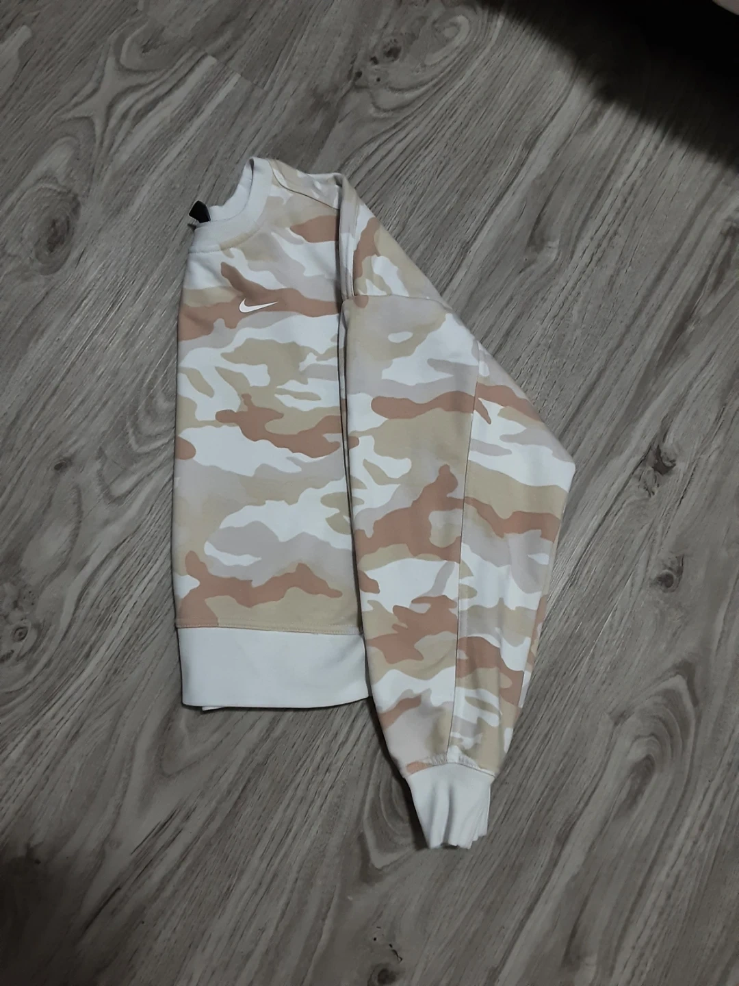 A Nike dri-fit crewneck sweatshirt with a camouflage pattern. It's made of a soft fabric blend. This sweatshirt is great for casual wear.