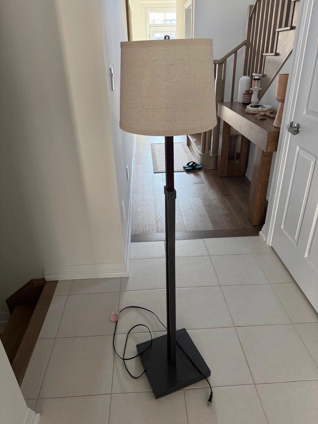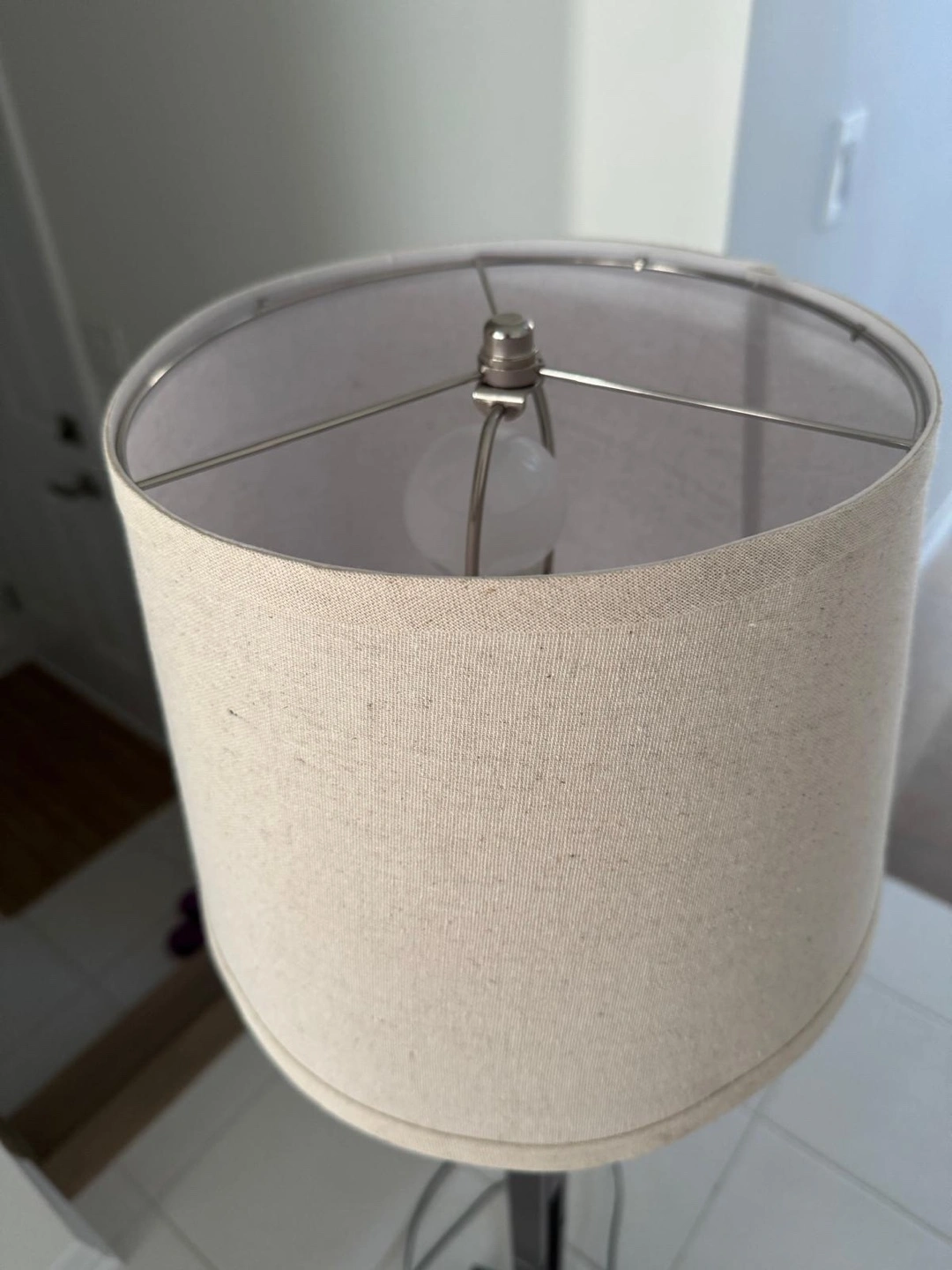 A simple floor lamp with a beige shade. It's in good condition and perfect for adding some light to any room