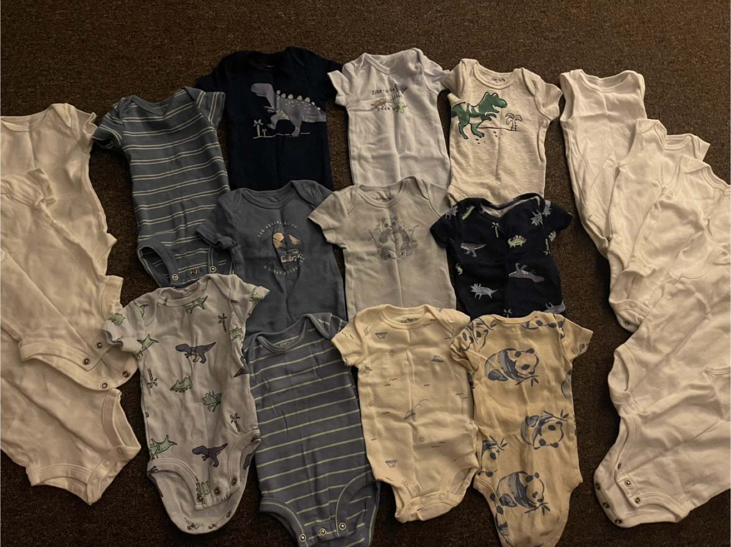 A collection of 15 newborn baby onesies in various styles. Includes dinosaur, panda, and striped patterns. Mostly short-sleeve designs with a few long-sleeve options. Assorted colors and sizes. They're made from soft cotton material. Great for everyday wear!