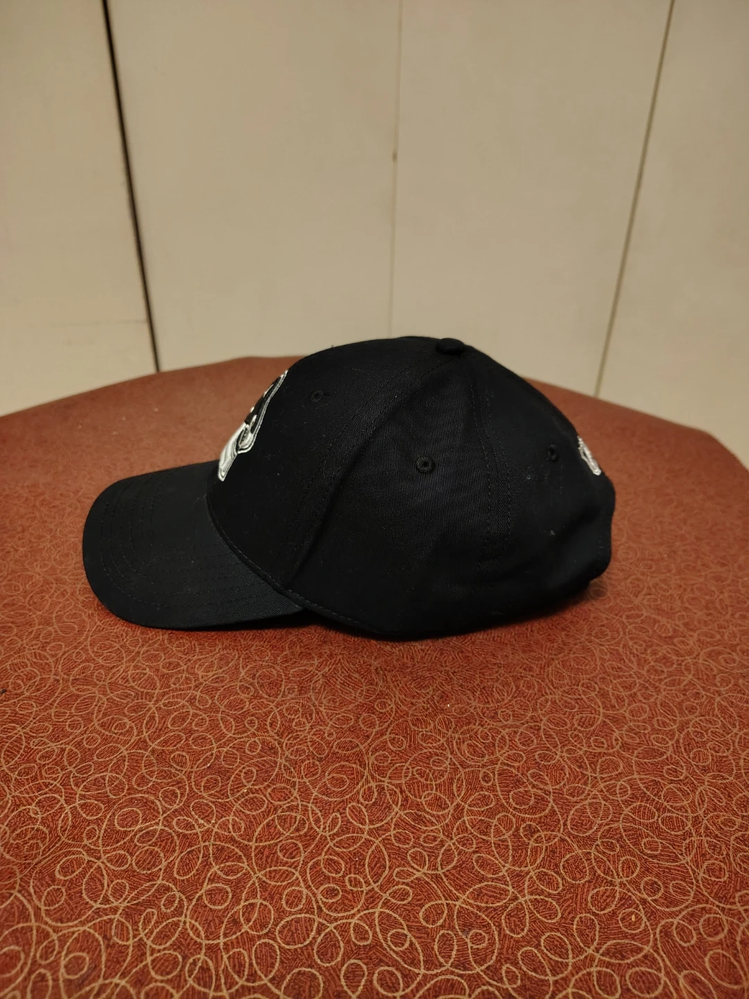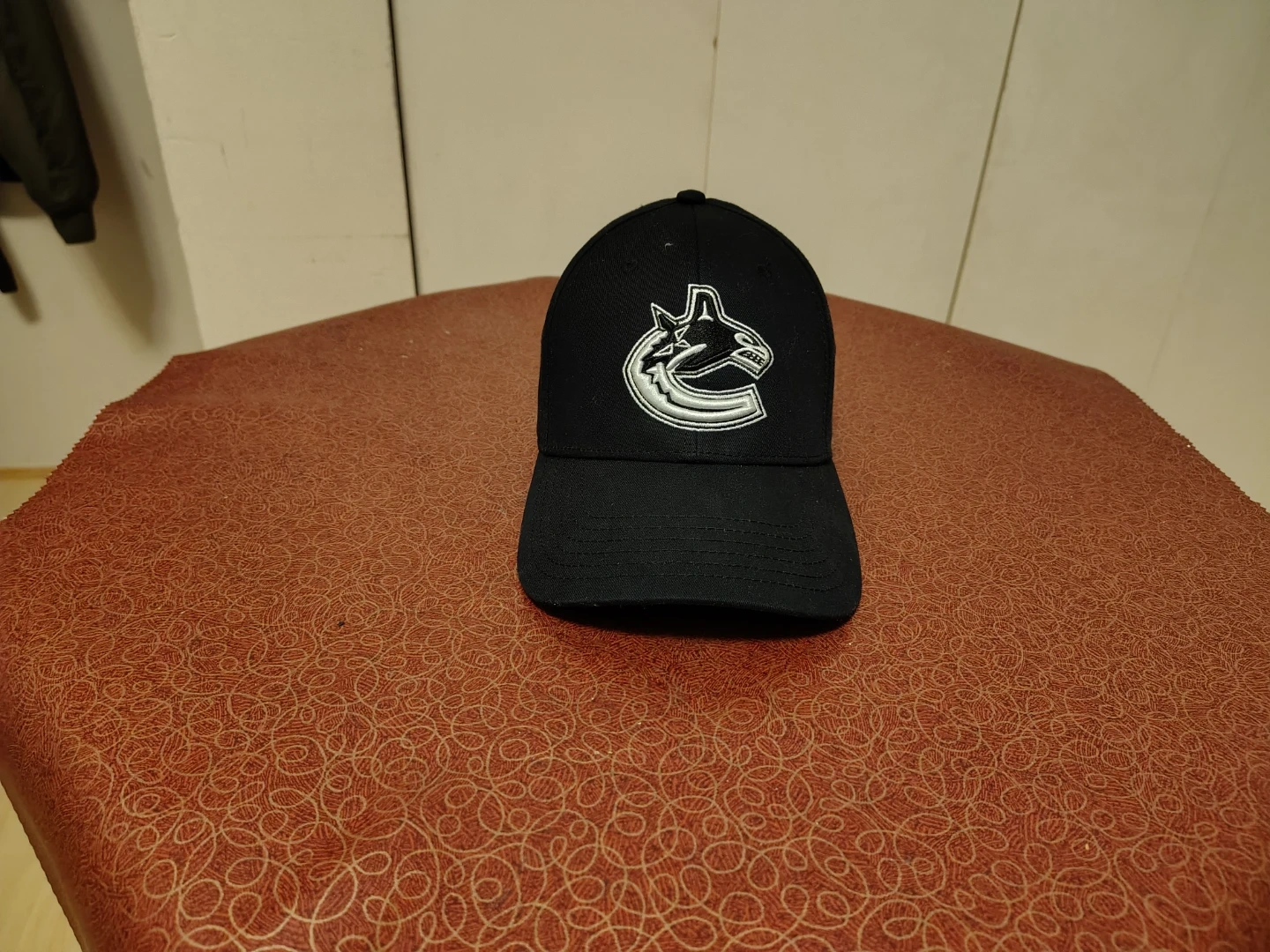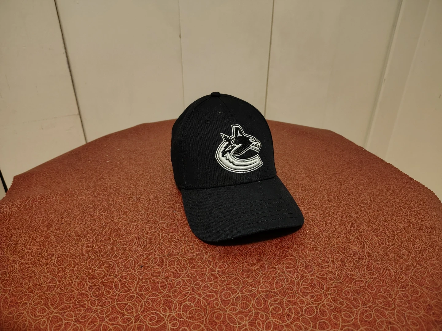 Black baseball cap featuring the Vancouver Canucks logo. It also has the NHL logo on the back. Made from cloth material.