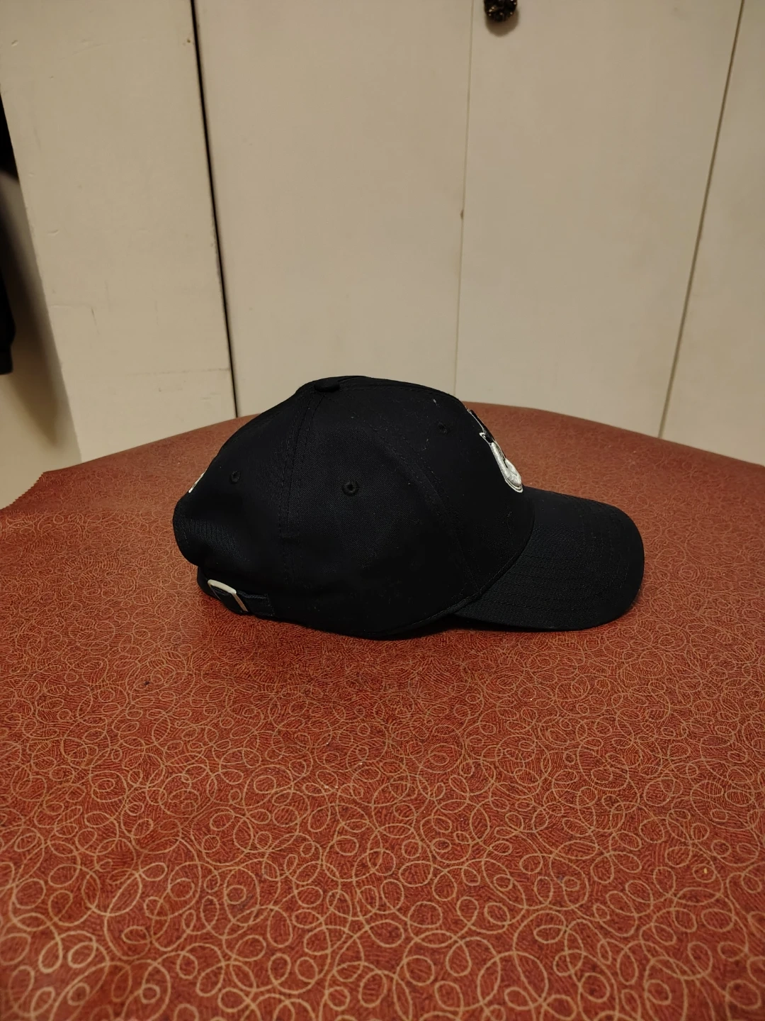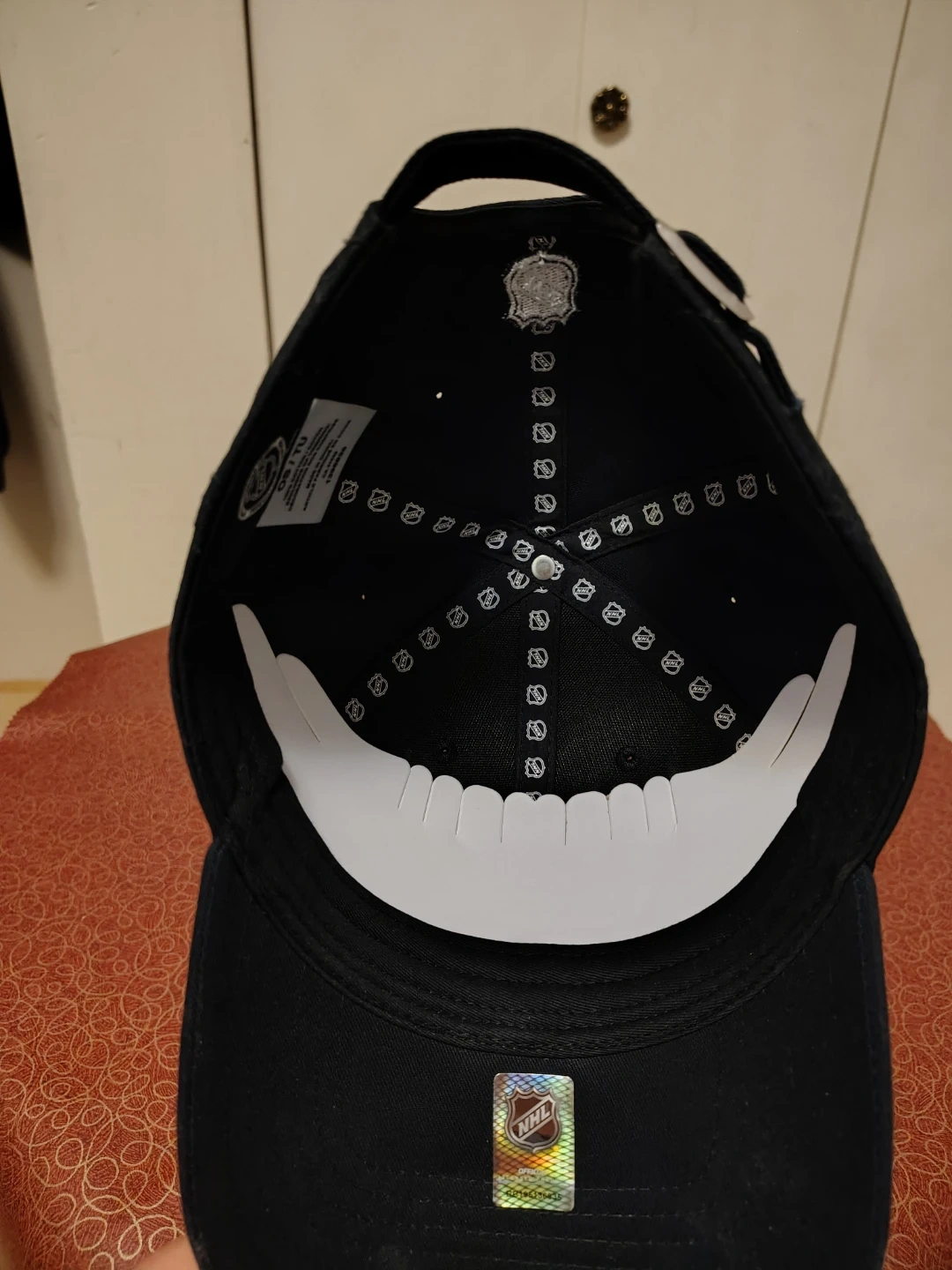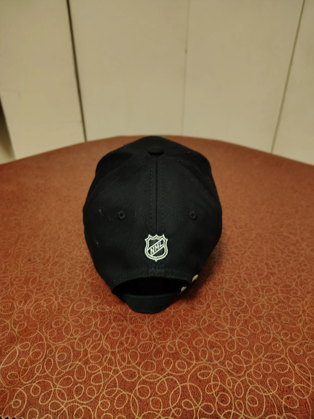 Black baseball cap featuring the Vancouver Canucks logo. It also has the NHL logo on the back. Made from cloth material.