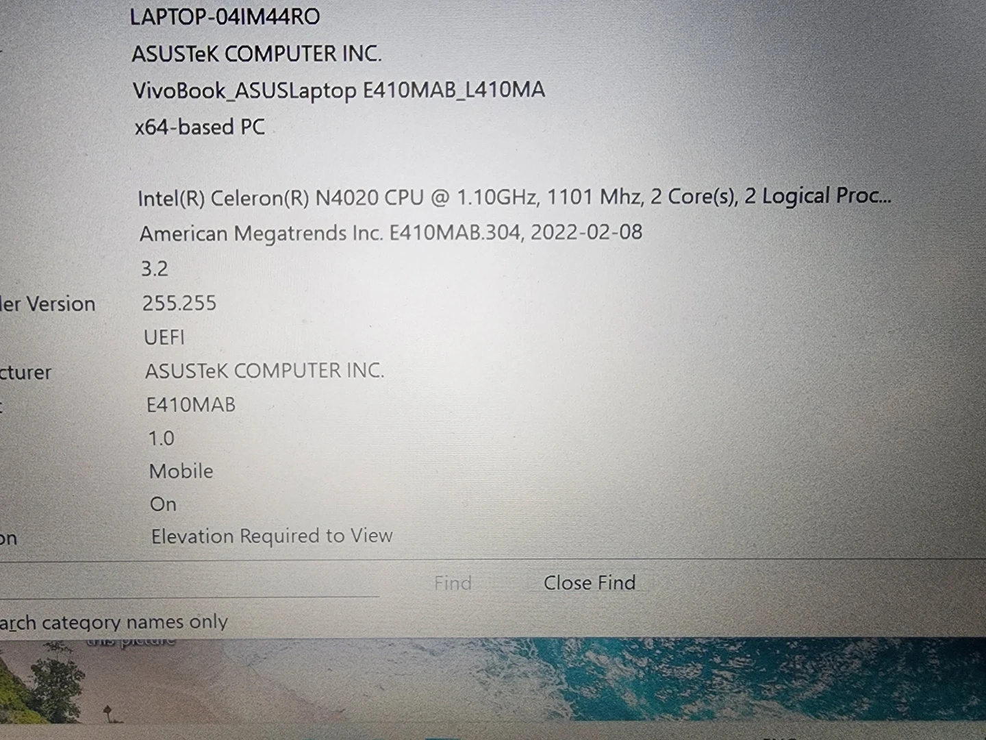 ASUS E410MA laptop from 2020. It's got an Intel Celeron N4020 processor, 4GB RAM, and 64GB eMMC storage. The battery has approximately 3 hours. This laptop is good for basic computing tasks.