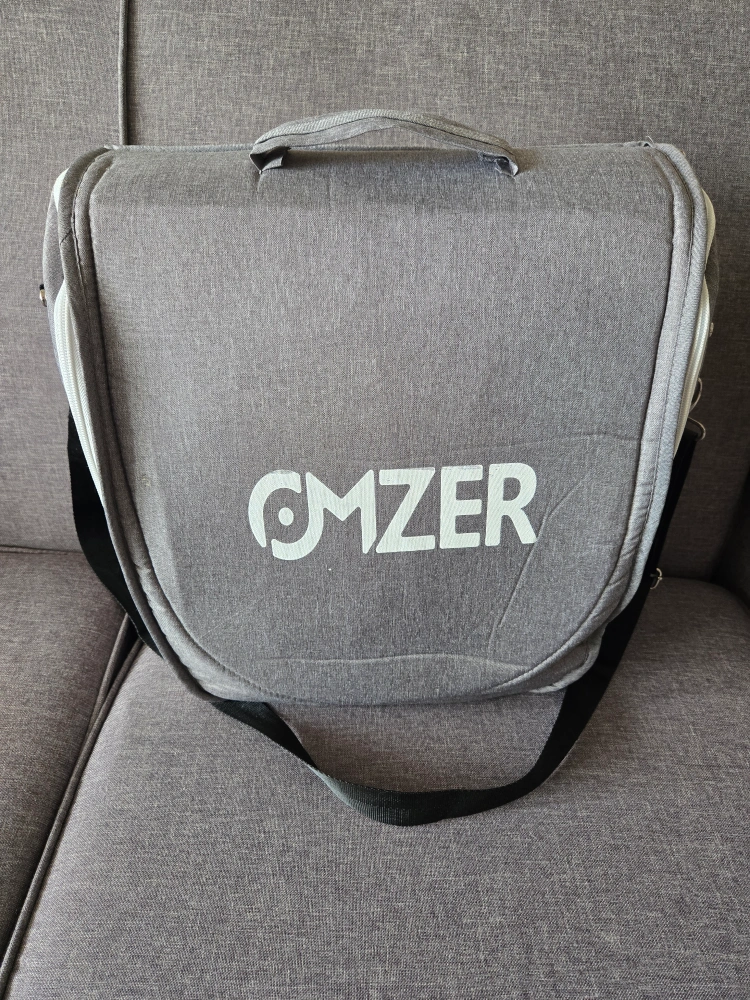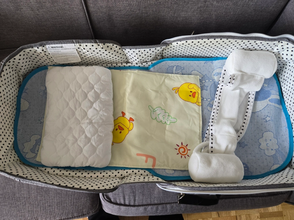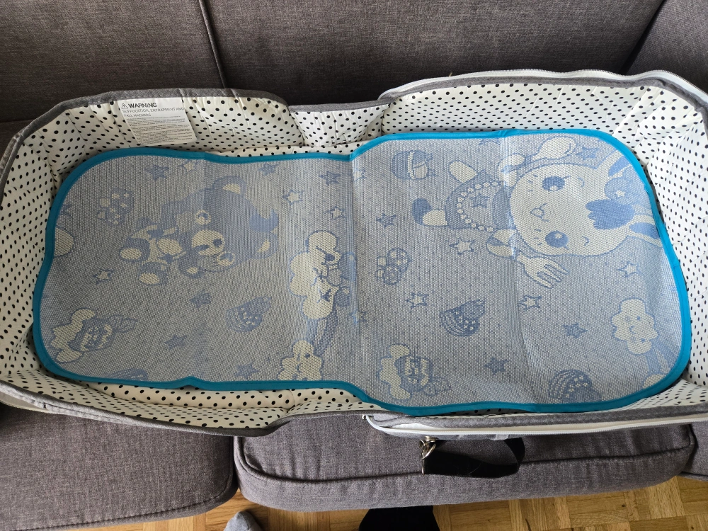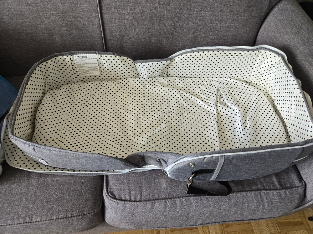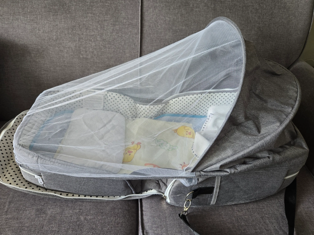 This portable baby bassinet by OMZER is perfect for travel or keeping baby close! It's in great condition and features a grey exterior with a polka dot interior lining. Includes a removable mosquito net and carrying strap for easy transport