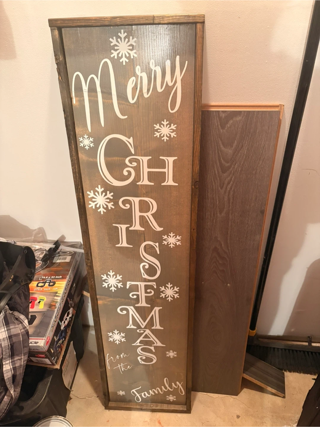 This rustic wooden sign says "Merry Christmas" with "from the Family" at the bottom. It's decorated with snowflakes. This sign is perfect for your front porch this holiday season!