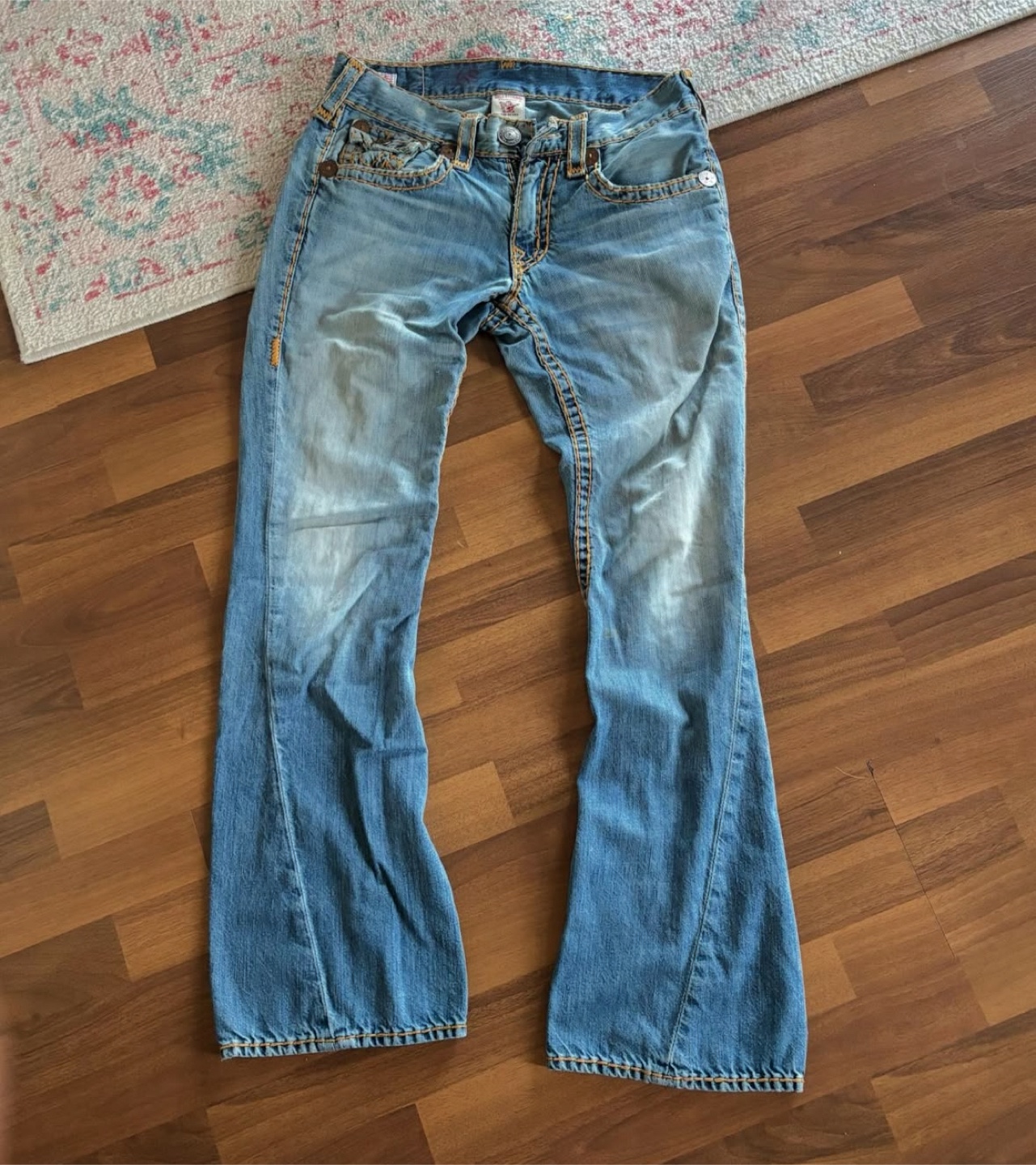 True Religion jeans in a light wash denim. These jeans have a distinct design with detailed stitching and the brand's signature back pocket flaps. They're in good condition and ready for a new home!