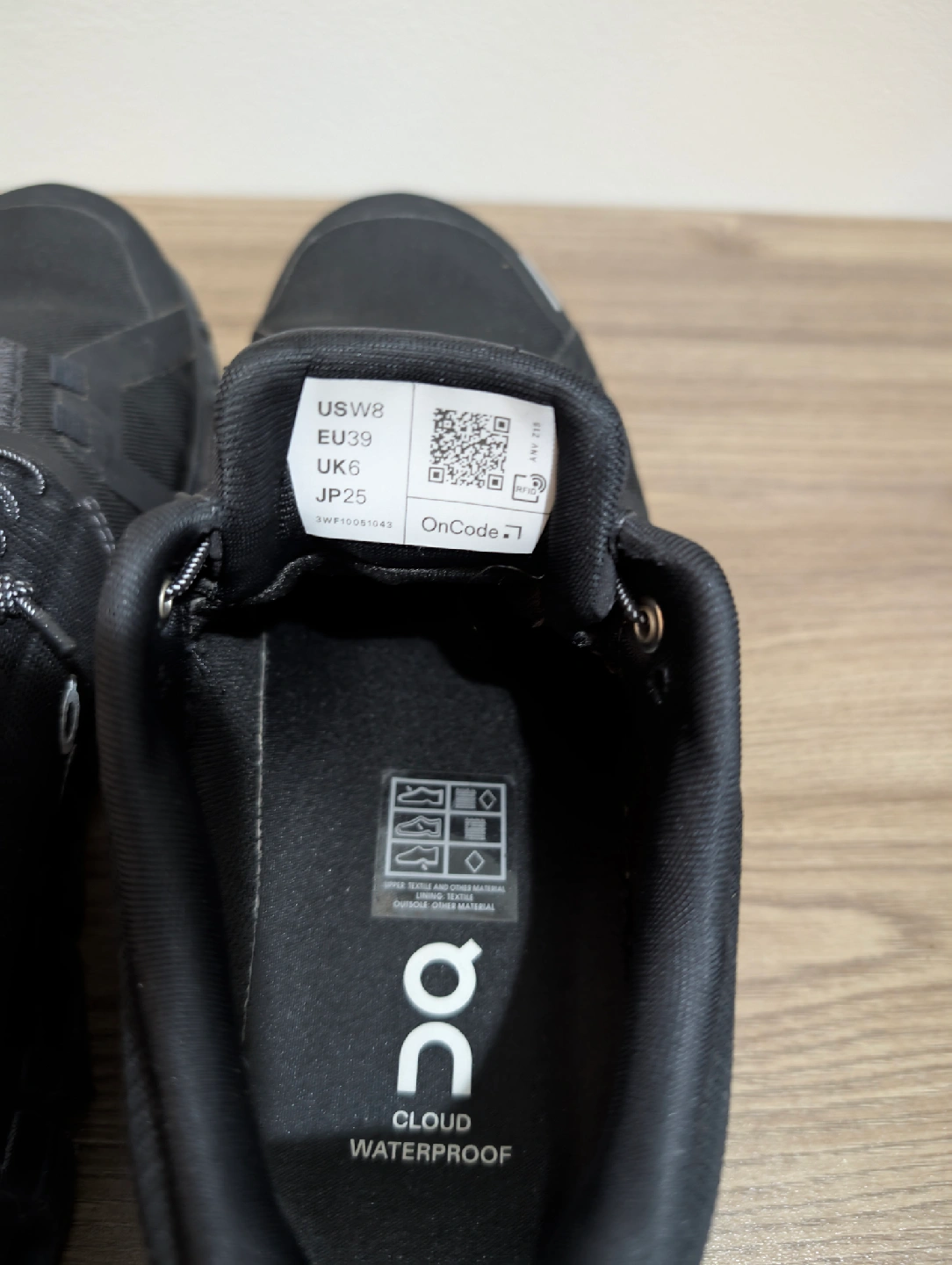 62Selling a pair of On Cloud Waterproof running shoes in women's size US 8. These shoes are all black and in great condition! They are designed to be waterproof and comfortable for running or everyday wear. Comes with an extra pair of laces.