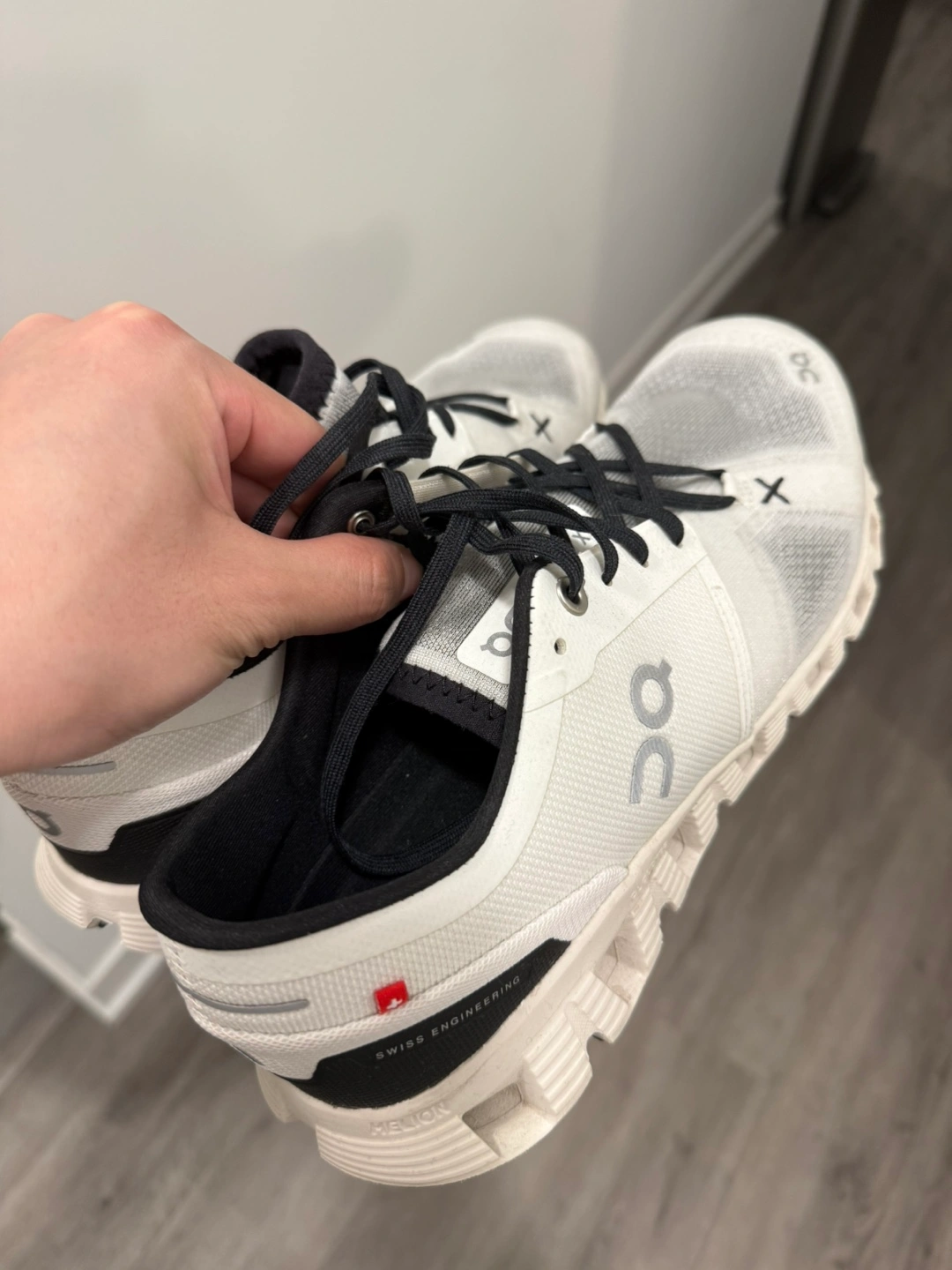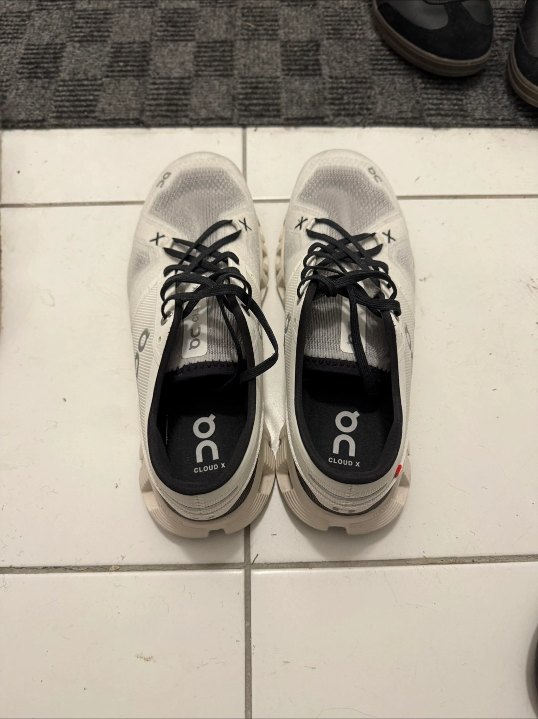 Selling a pair of ON Cloud X running shoes in white and black. These are great for running or everyday wear. They are in good condition- wore only twice!