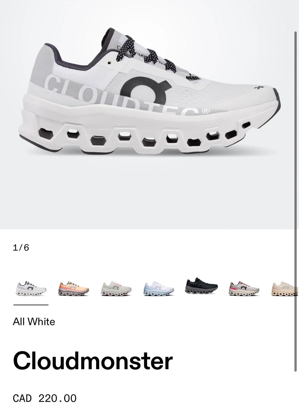 177Selling a pair of On Cloudmonster running shoes in all white! They're super lightweight and great for running or just everyday wear. The unique CloudTec sole provides excellent cushioning and a responsive feel. Perfect for anyone looking for a comfortable and stylish running shoe