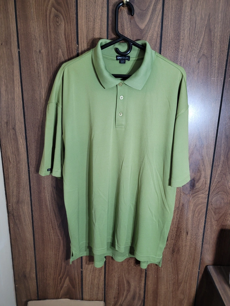 197Selling a gently used ON TOUR polo shirt in a nice light green colour. It's made of 100% microfibre polyester, so it's lightweight and breathable. The size is XL. Perfect for a casual day out or a round of golf