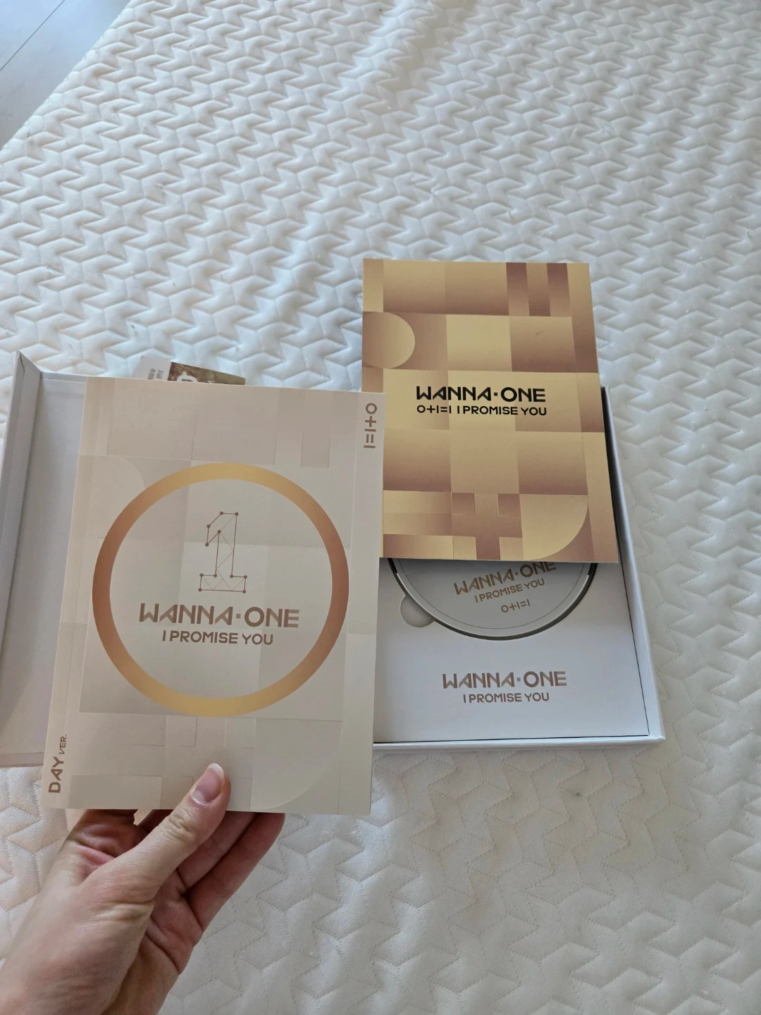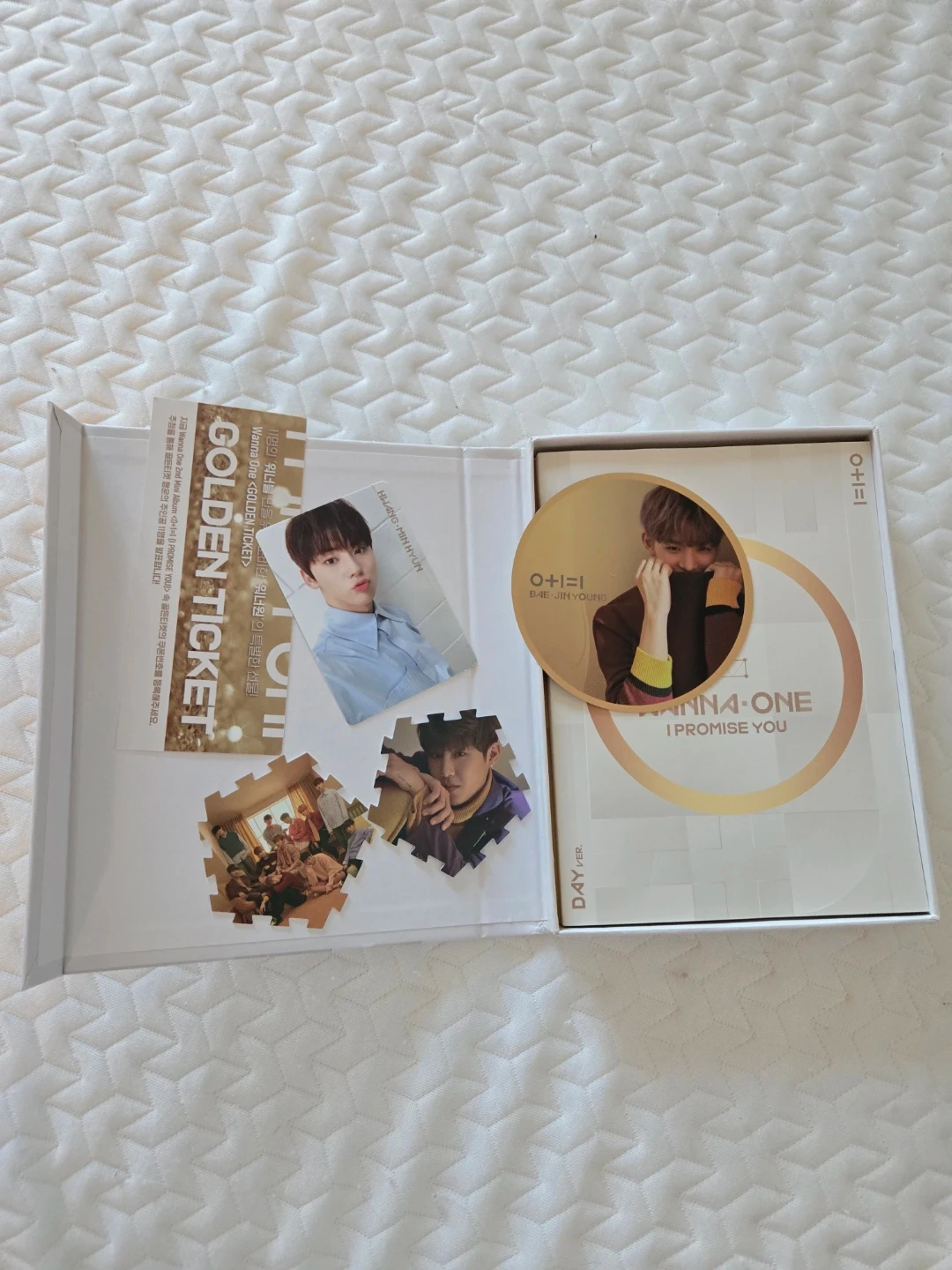 This is the Wanna One O+I=1 I Promise You album. It includes photo cards and puzzle pieces. The album cover is signed by the members.