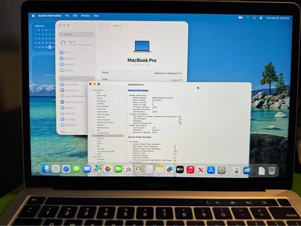 MacBook Pro 13-inch with Apple M2 chip. 8GB RAM, 256GB storage. Battery health is 94% with 215 cycle count. Charger is included.
