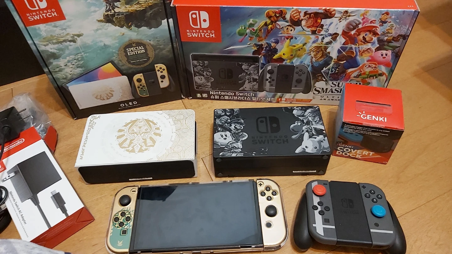 CIB OLED Switch with Smash Bros dock and Zelda Edition Dock (2x docks) and joycons (4 joycons total) Has had Screensaver since purchased and comes with carrying case, Genki Covert Dock and 32Gb Microsd