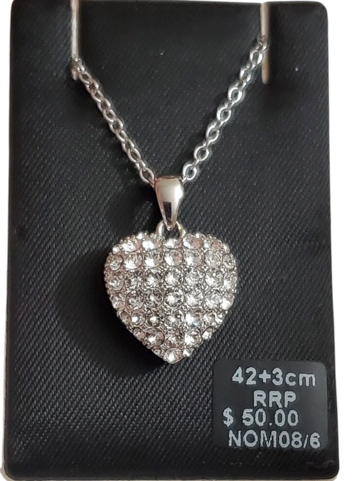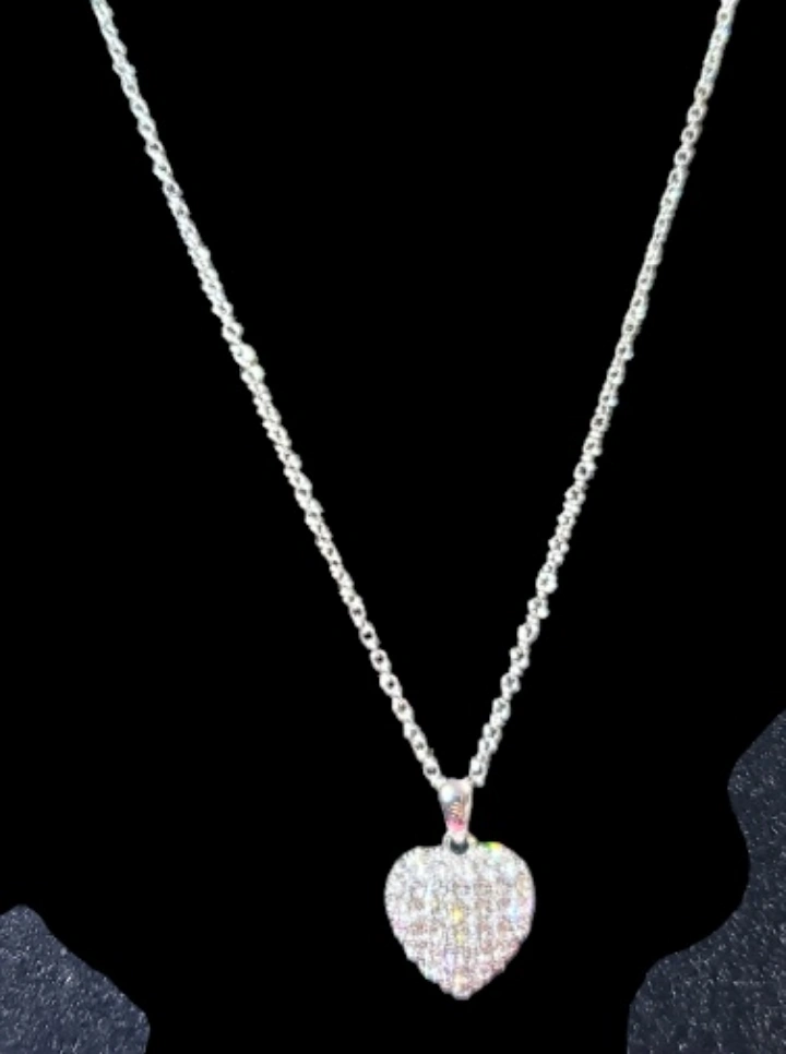 Silver chain necklace with a swarovski crystals heart pendant covered. The heart has a cutout design, revealing small hearts inside.