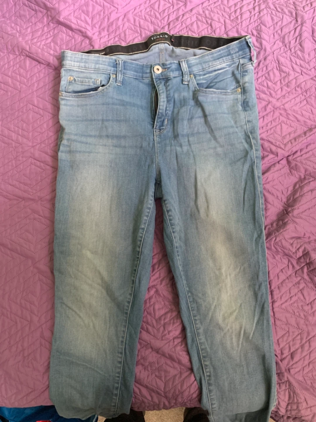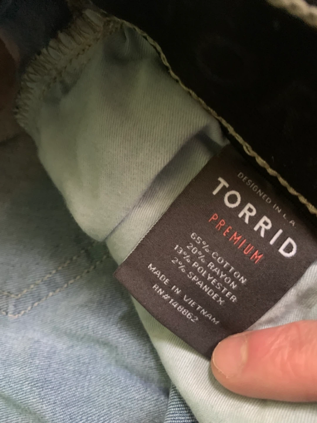 These are Torrid Premium Sky High Skinny Jeans. They're made with 65% cotton, 20% rayon, 13% polyester, and 2% spandex. The size is 34 x 32.