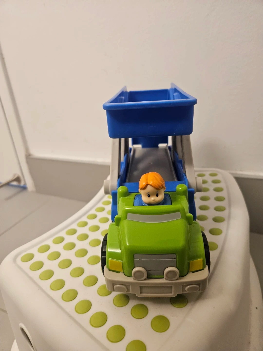 This is a blue and green toy car carrier truck. It includes a small figure with orange hair. The ramp and carrier bed are adjustable.