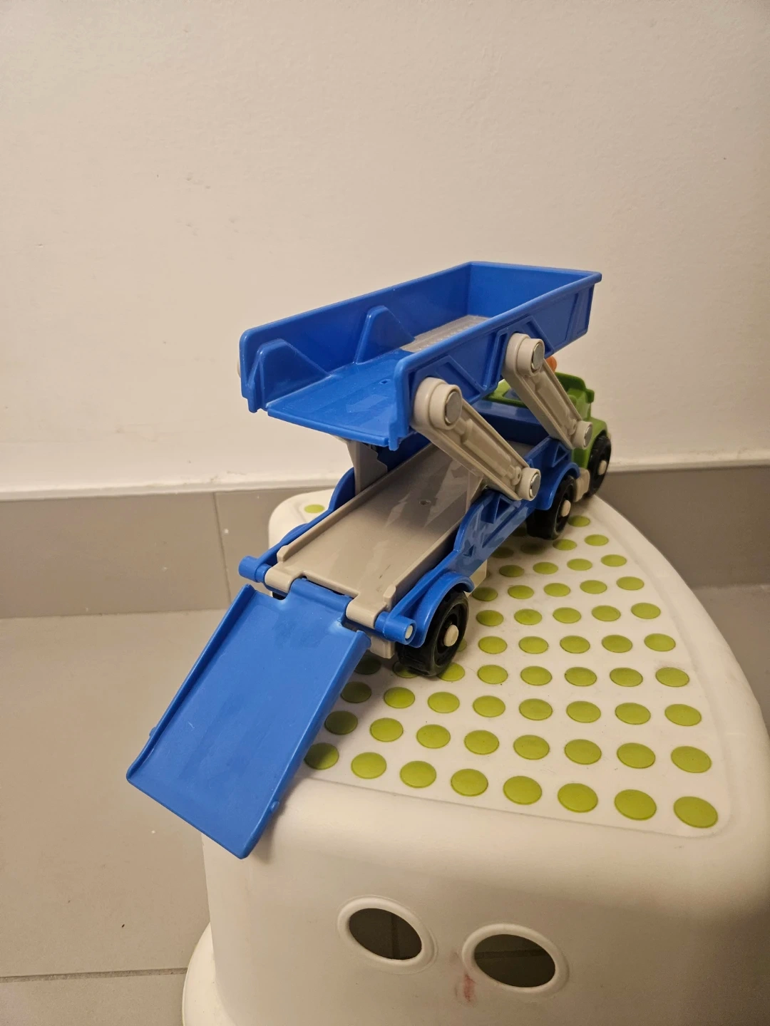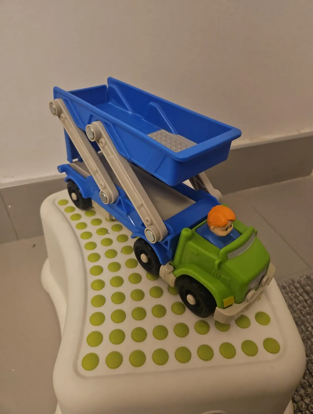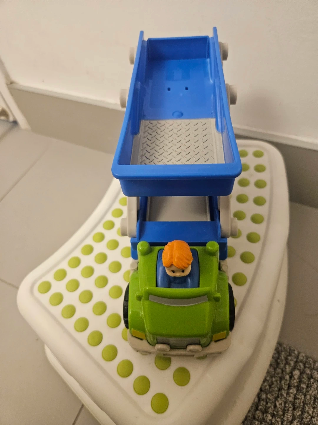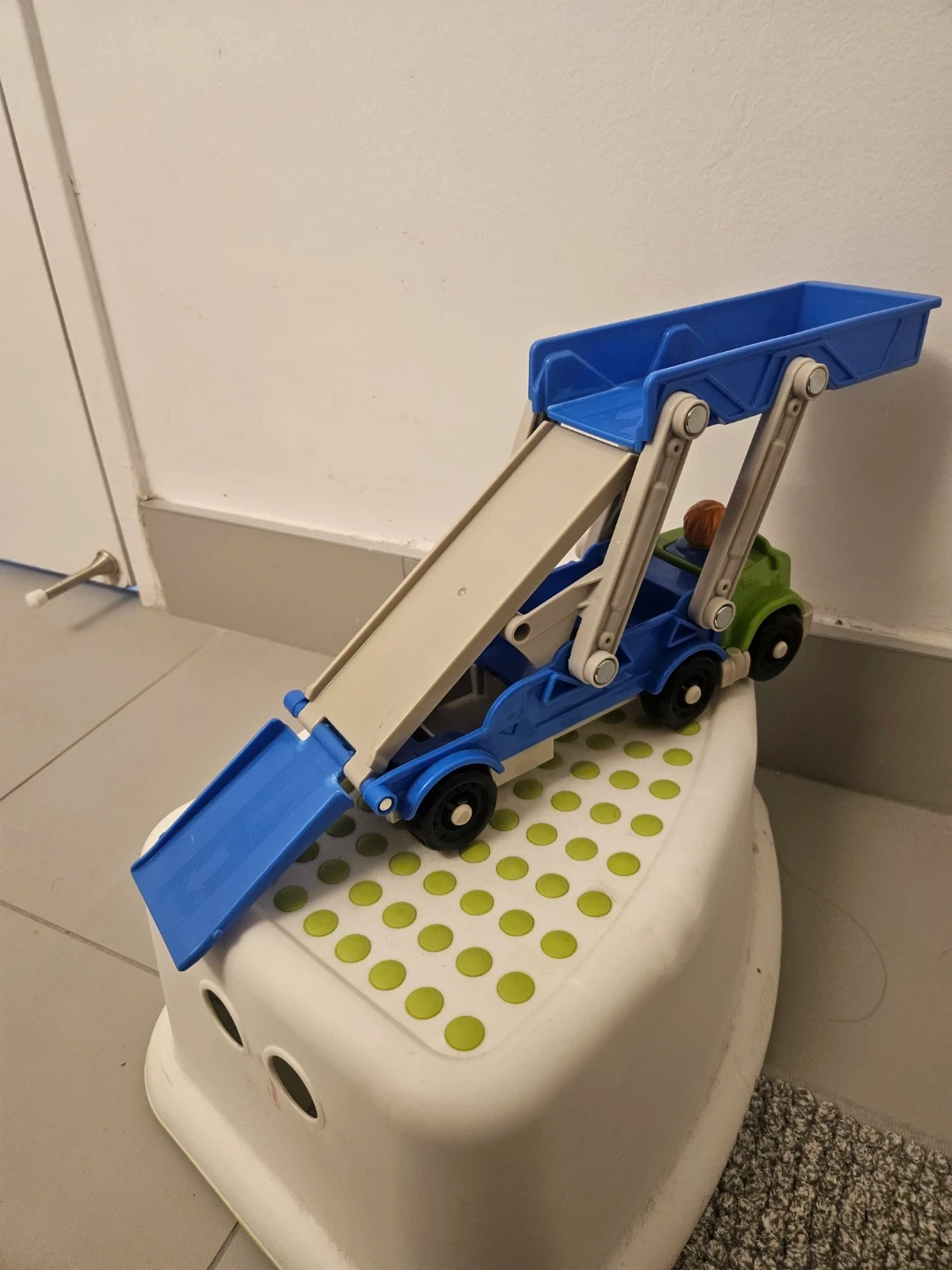 This is a blue and green toy car carrier truck. It includes a small figure with orange hair. The ramp and carrier bed are adjustable.