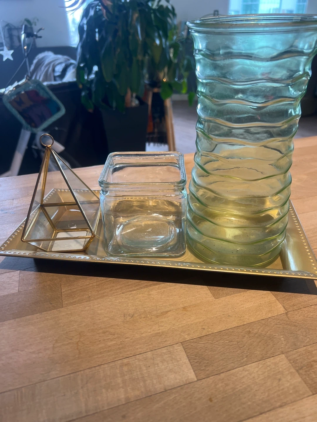 Three-piece decorative set including a geometric glass terrarium, a small glass jar, and a green wavy glass vase. All items are displayed on a rectangular gold-toned decorative tray.