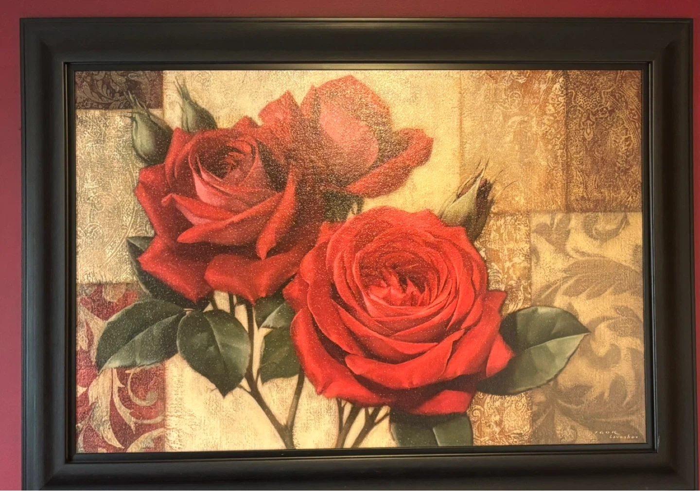 This framed artwork features a beautiful depiction of red roses against a textured, patterned background. It's ready to hang and would add a touch of elegance to any room. The piece is framed in a black moulding.