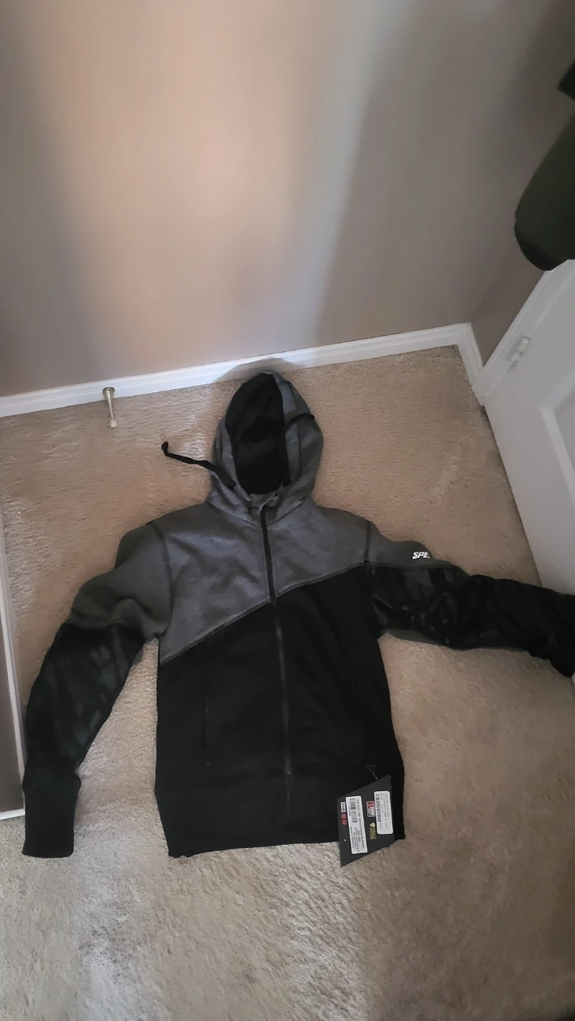 This hoodie features a two-tone design with grey and black colour blocking. It has contrasting faux leather sleeves with a subtle pattern. The hood is adjustable with drawstrings. It's a comfortable and stylish piece for casual wear. It is armored.