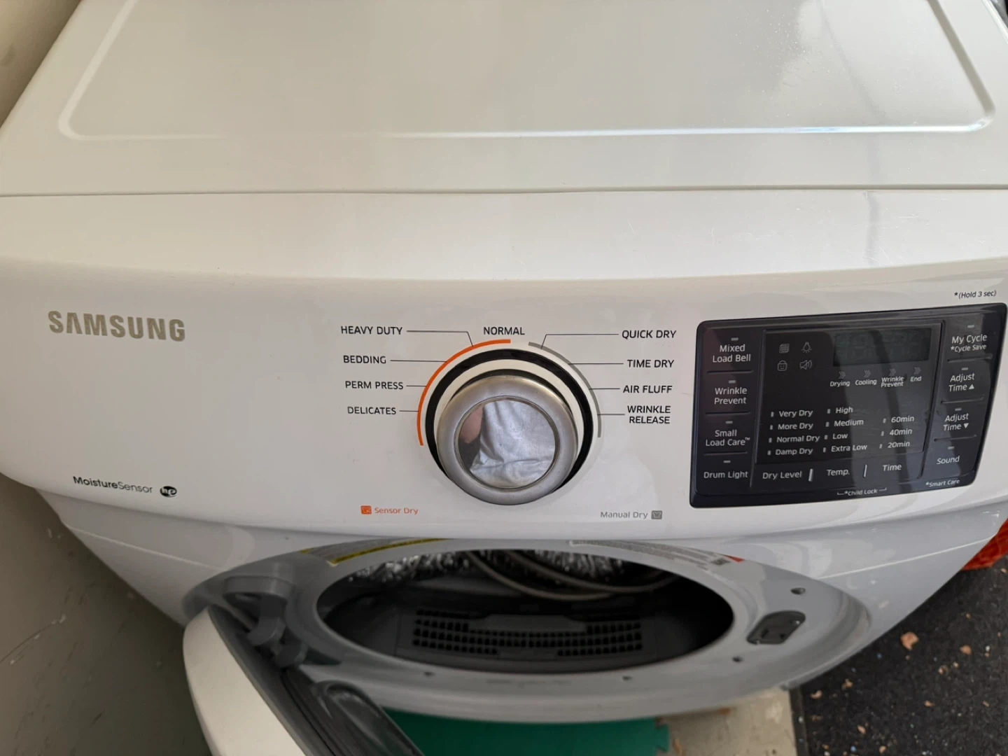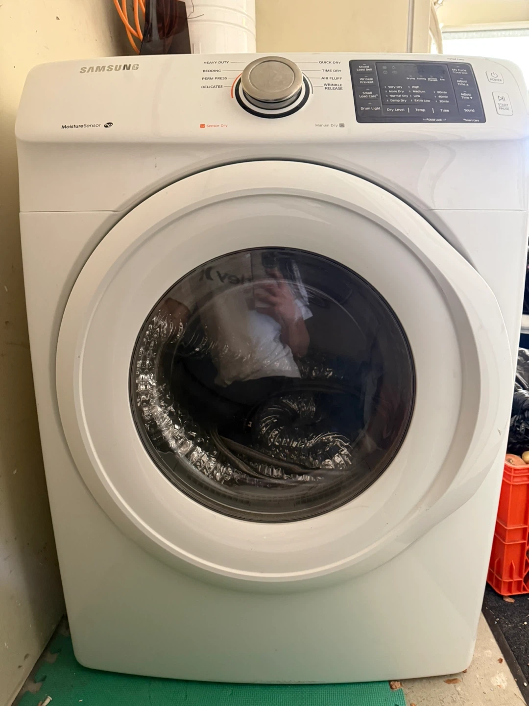 White Samsung clothes dryer with multiple settings like Heavy Duty, Normal, and Quick Dry, etc. Includes MoistureSensor technology for efficient drying. Works perfectly need to sell because we got a different set