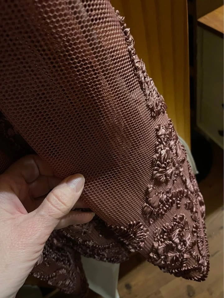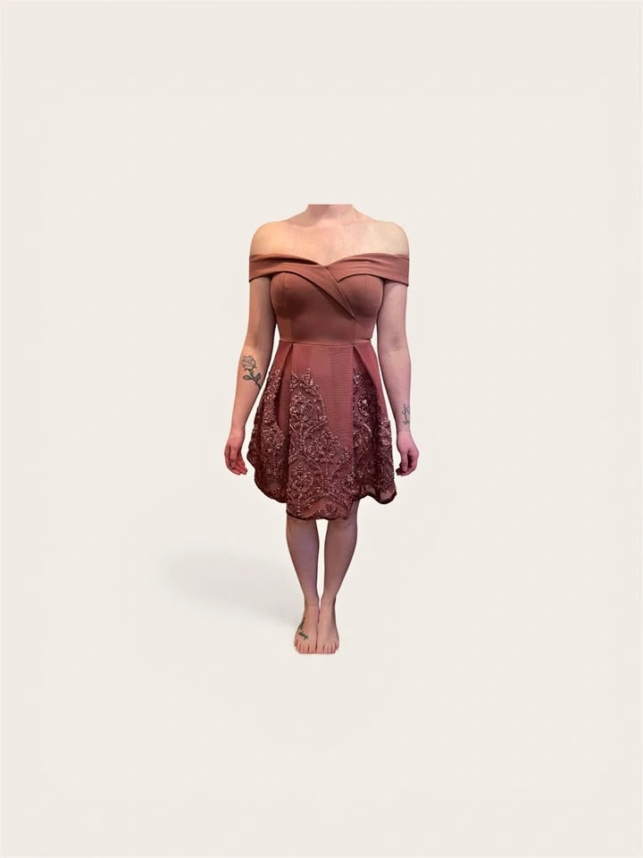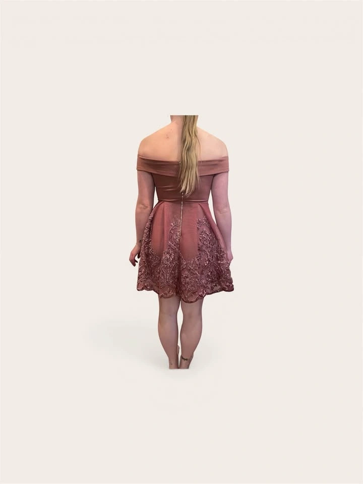 This elegant off-shoulder dress features intricate detailing, perfect for any special occasion. The beautiful coral hue adds a touch of femininity and charm. Size small. Worn once.