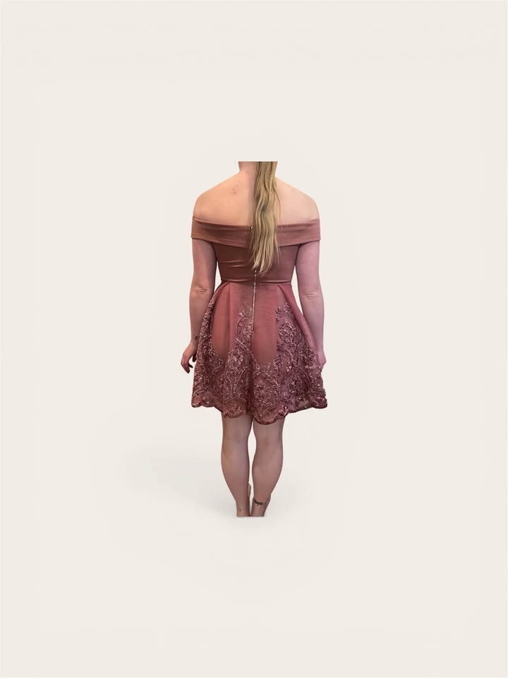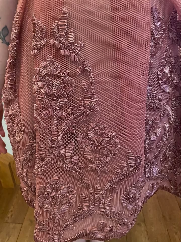 This elegant off-shoulder dress features intricate detailing, perfect for any special occasion. The beautiful coral hue adds a touch of femininity and charm. Size small. Worn once.