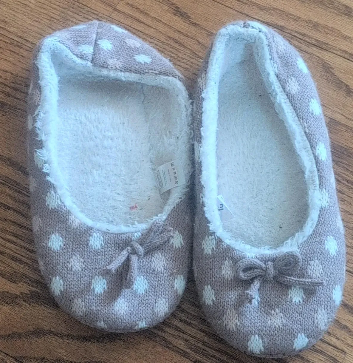 Cozy women's slippers in a taupe knit with white polka dots. They feature a plush white lining for extra warmth. Size is small.