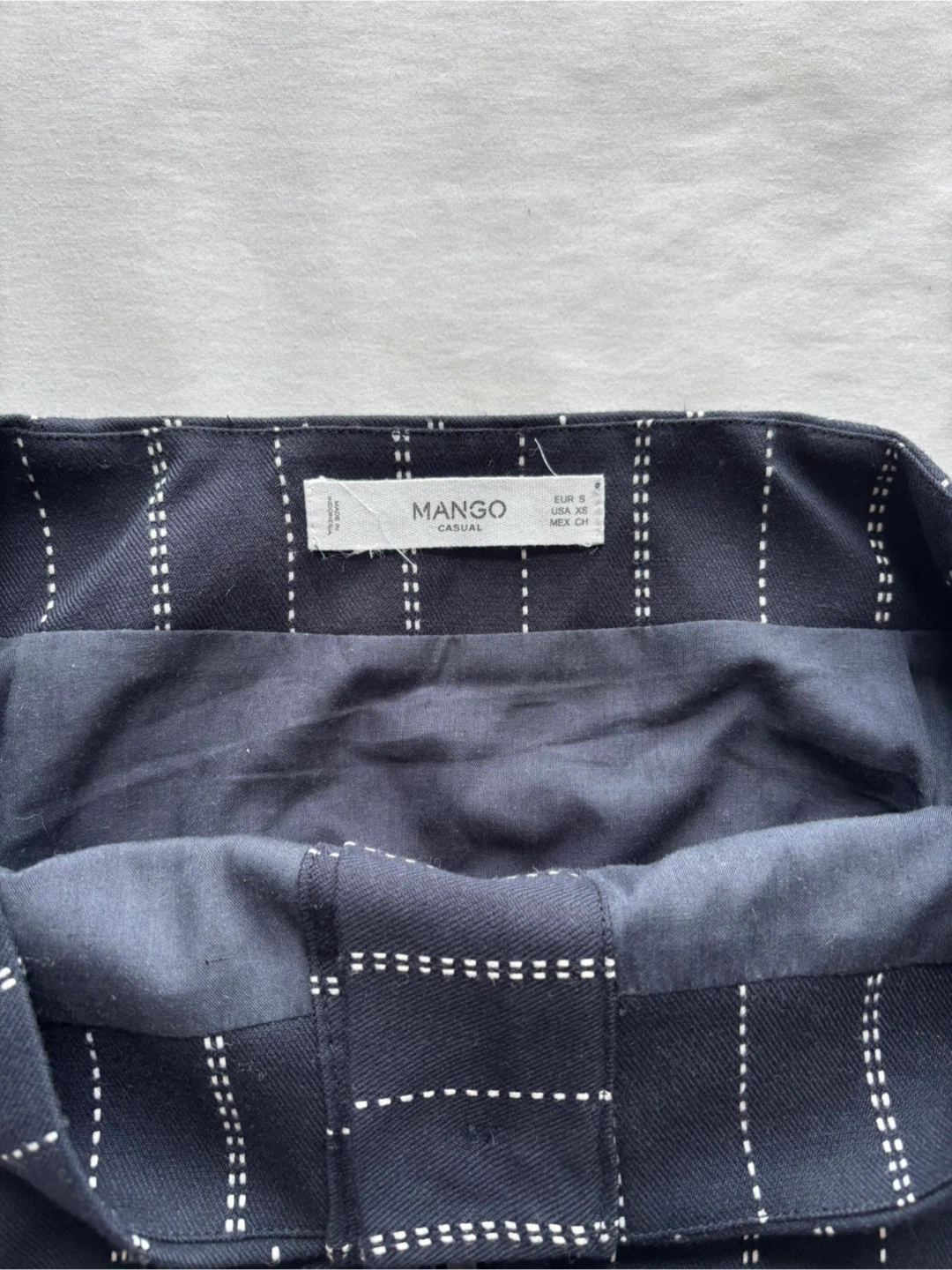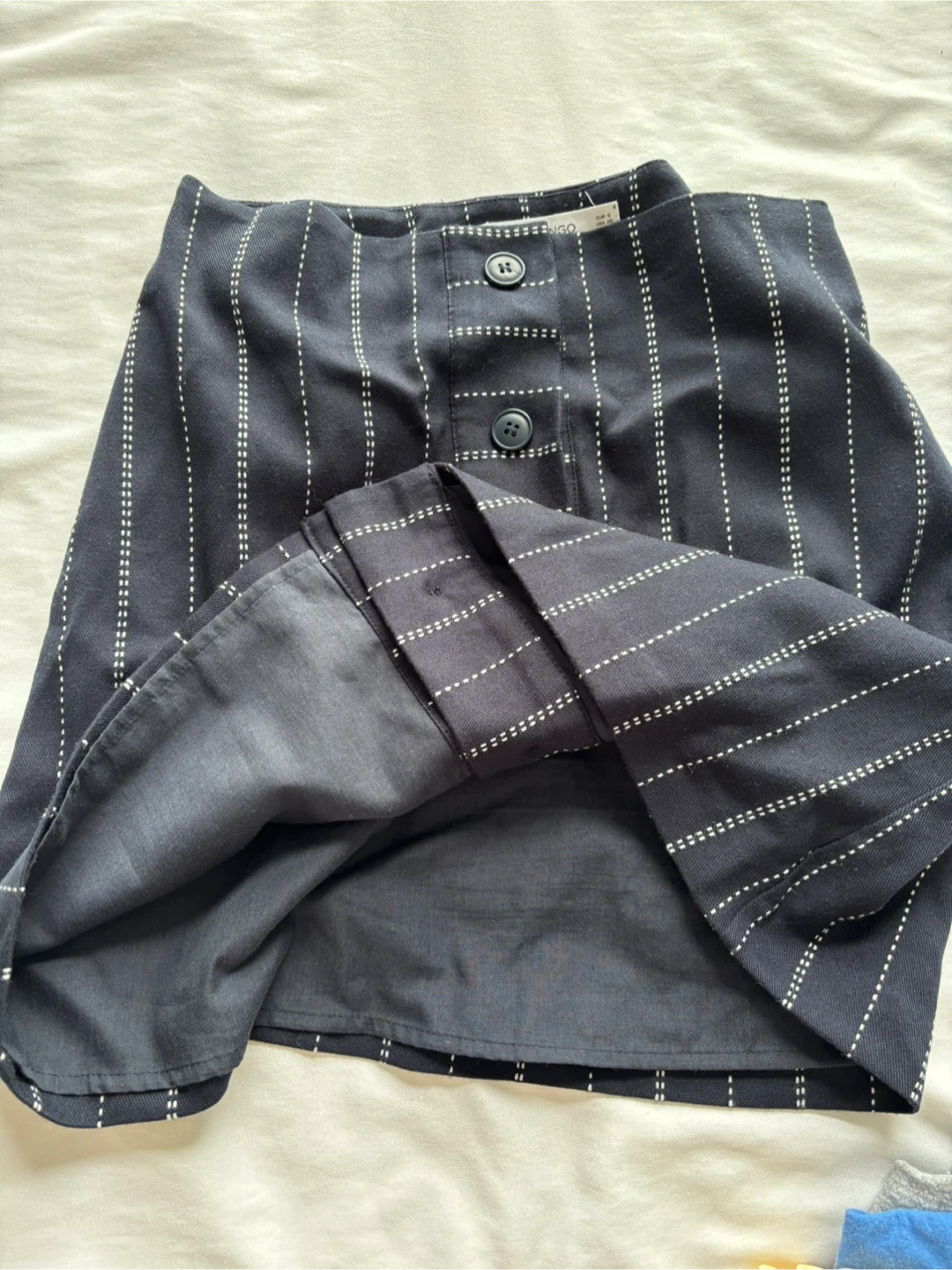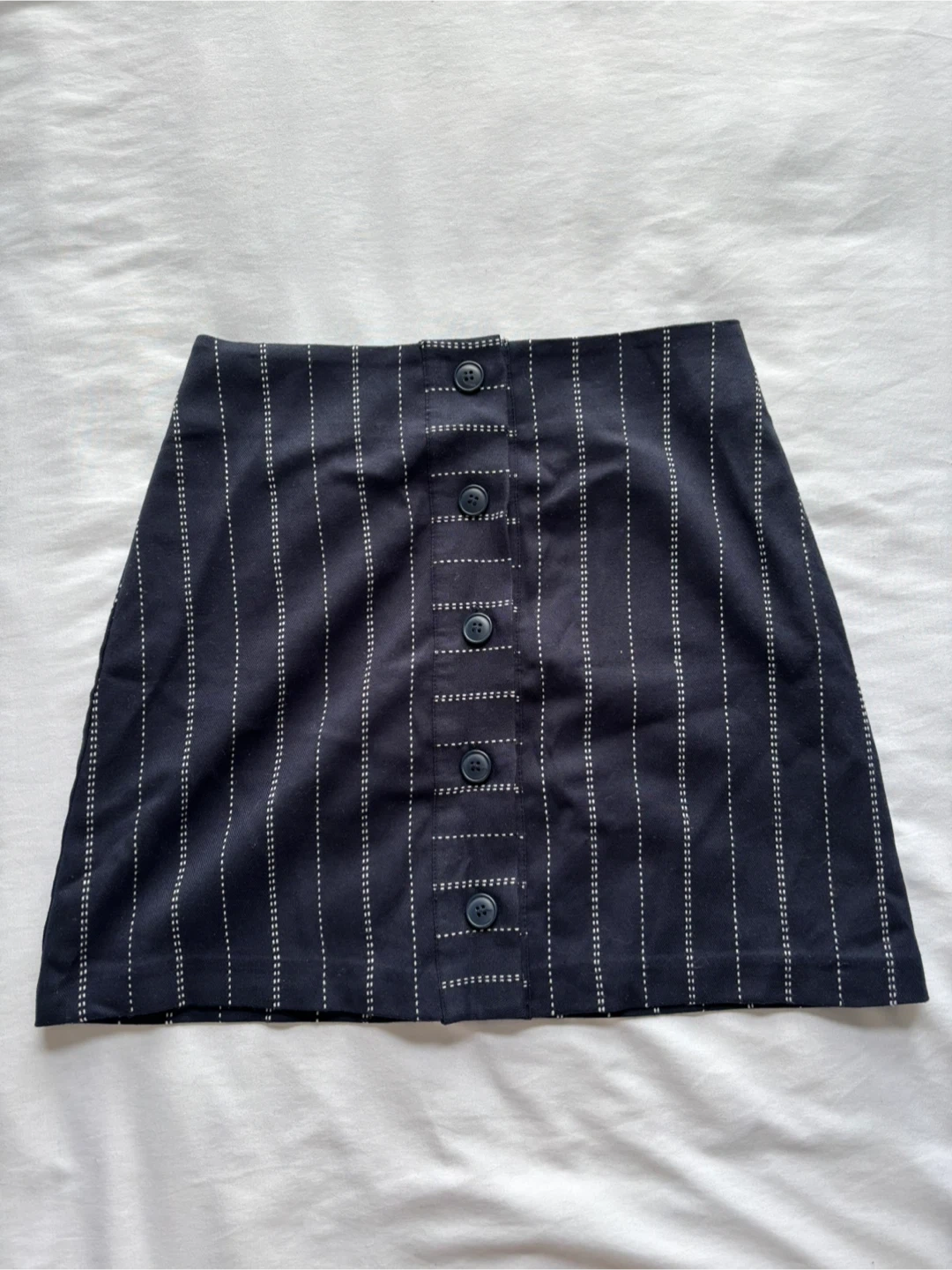 Dark navy mini skirt with white pinstripes and a button-front detail. It's a size Small, featuring a structured A-line silhouette. This skirt is great for casual outings or dressing up for a smart-casual look!