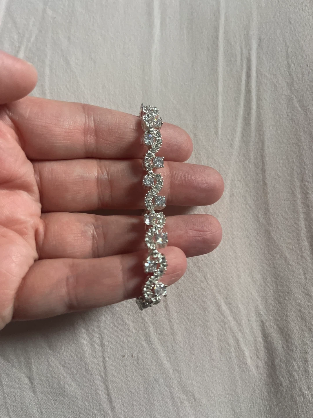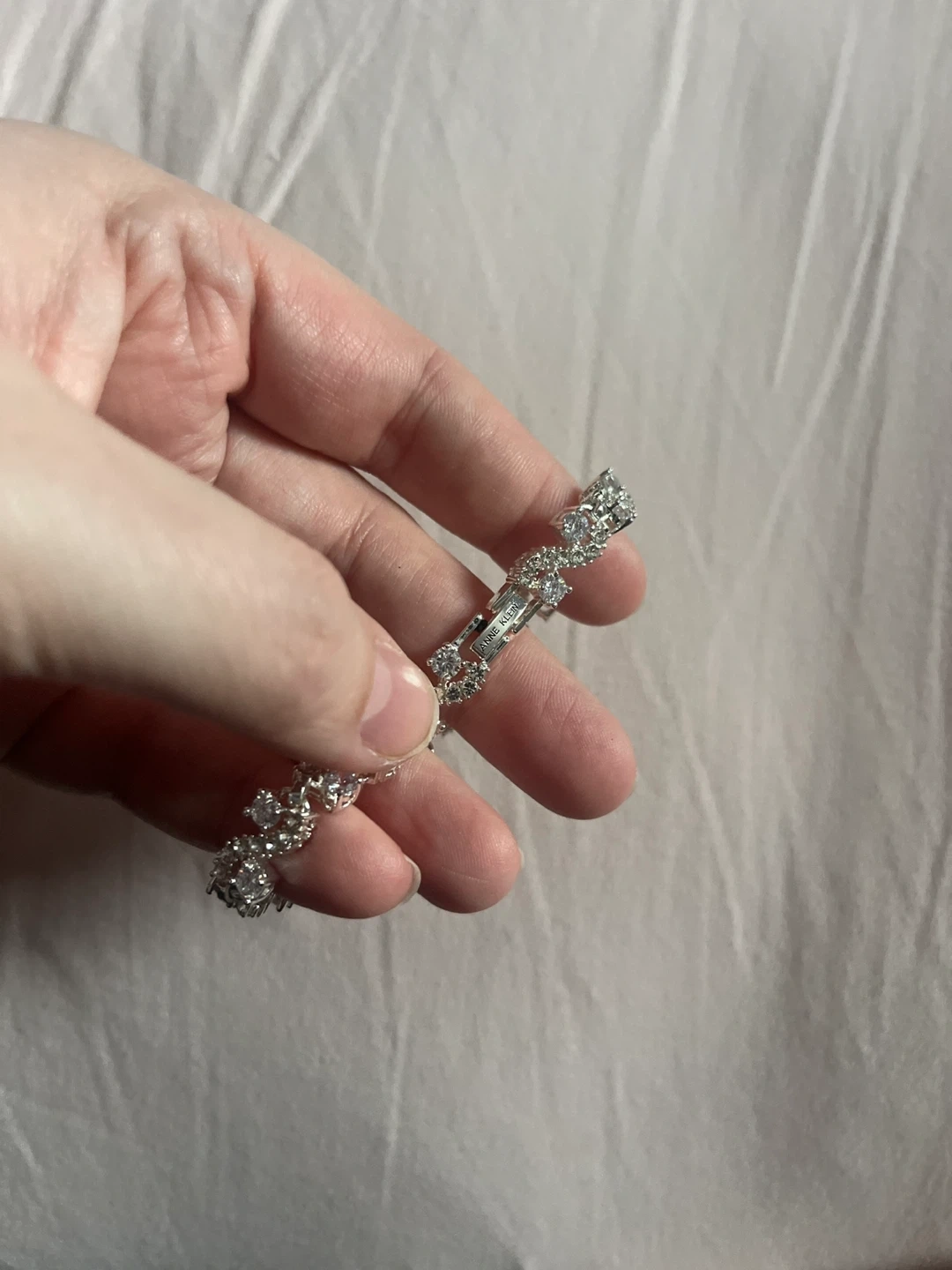 A beautiful, sparkly Anne Klein bracelet that adds a touch of glam. It's made with clear stones and a silver-toned metal. This piece is perfect for dressing up any outfit or for special occasions!
