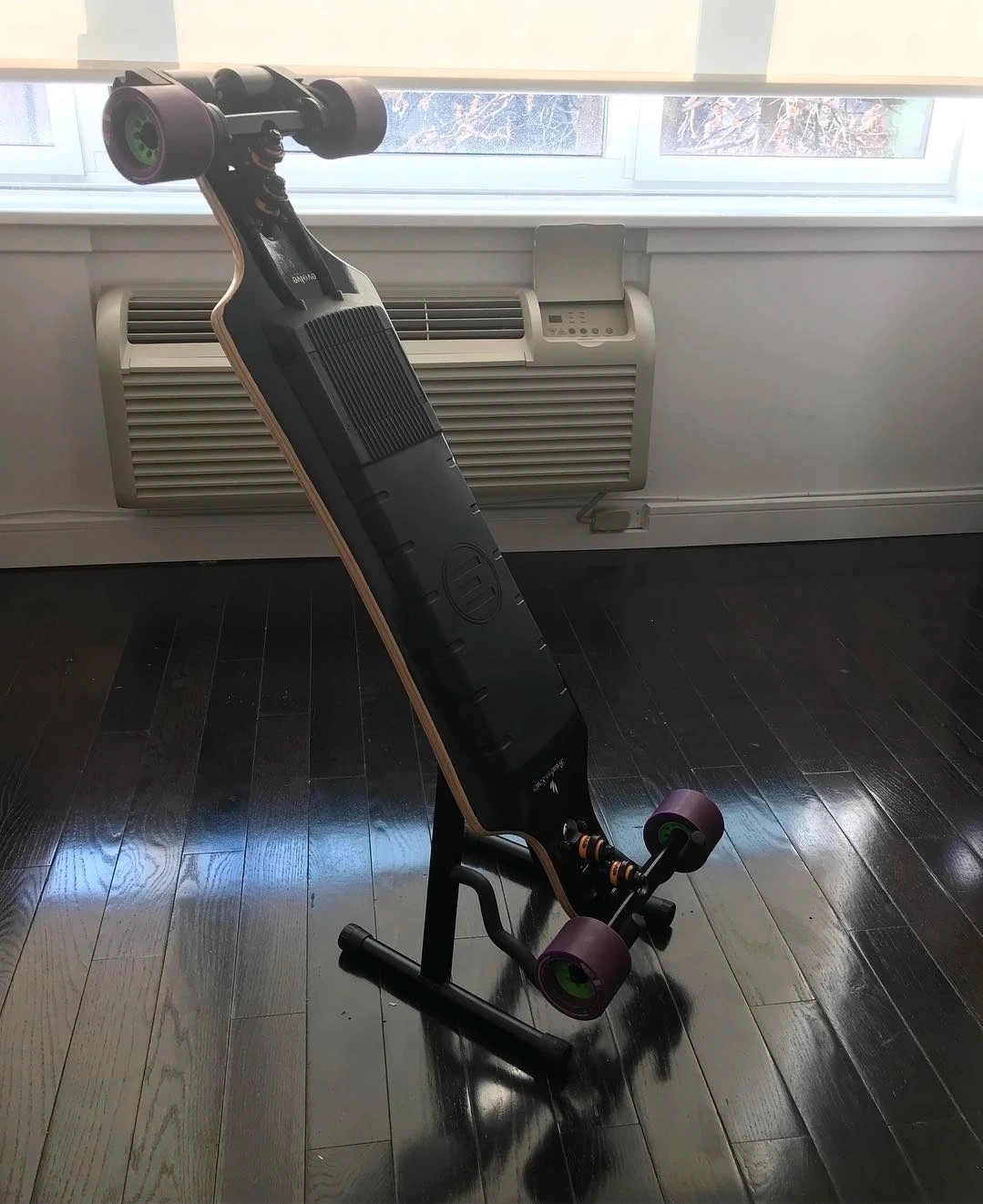 This is an Evolve GT Series electric skateboard. It features a unique graphic on the deck. The R2 remote is included with this board. and the original remote.