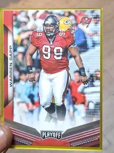 This is a 2006 Playoff football trading card featuring Warren Sapp. The card showcases Sapp in his Tampa Bay Buccaneers uniform. It's part of the Playoff series.