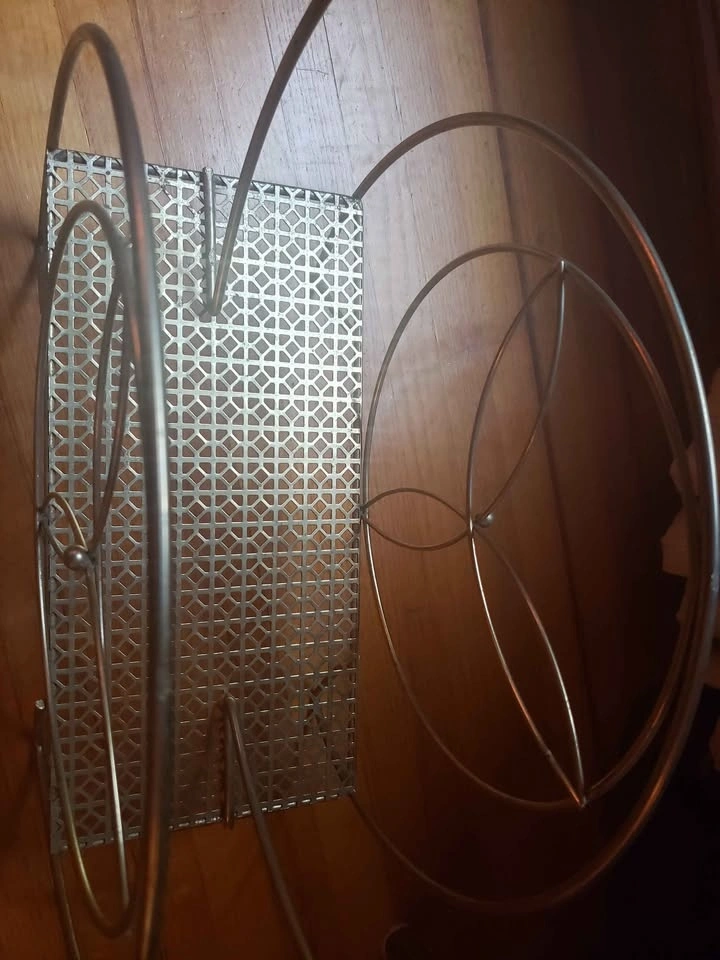 Mid-century modern brass magazine rack. 50s/60s. Very eye-catching round pinwheel design on both sides with a larger loop in the center for easy pick up. Solid interwoven pattern for the base. Lovely pointed feet. 18 inches tall by 15 inches long by 7 inches wide. Great condition for age.