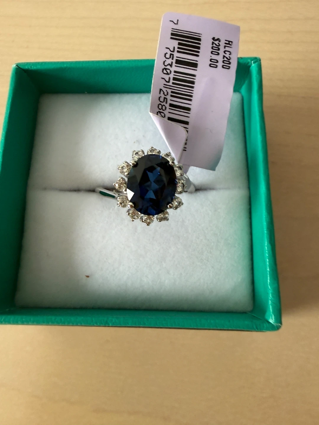 This EFY ring features a large, deep blue created gemstone surrounded by smaller clear stones. It's presented in a teal jewellery box, perfect for safekeeping. The original price was $200.00. The gemstones are created, and the band is silver-toned metal. Purchased from the BAY