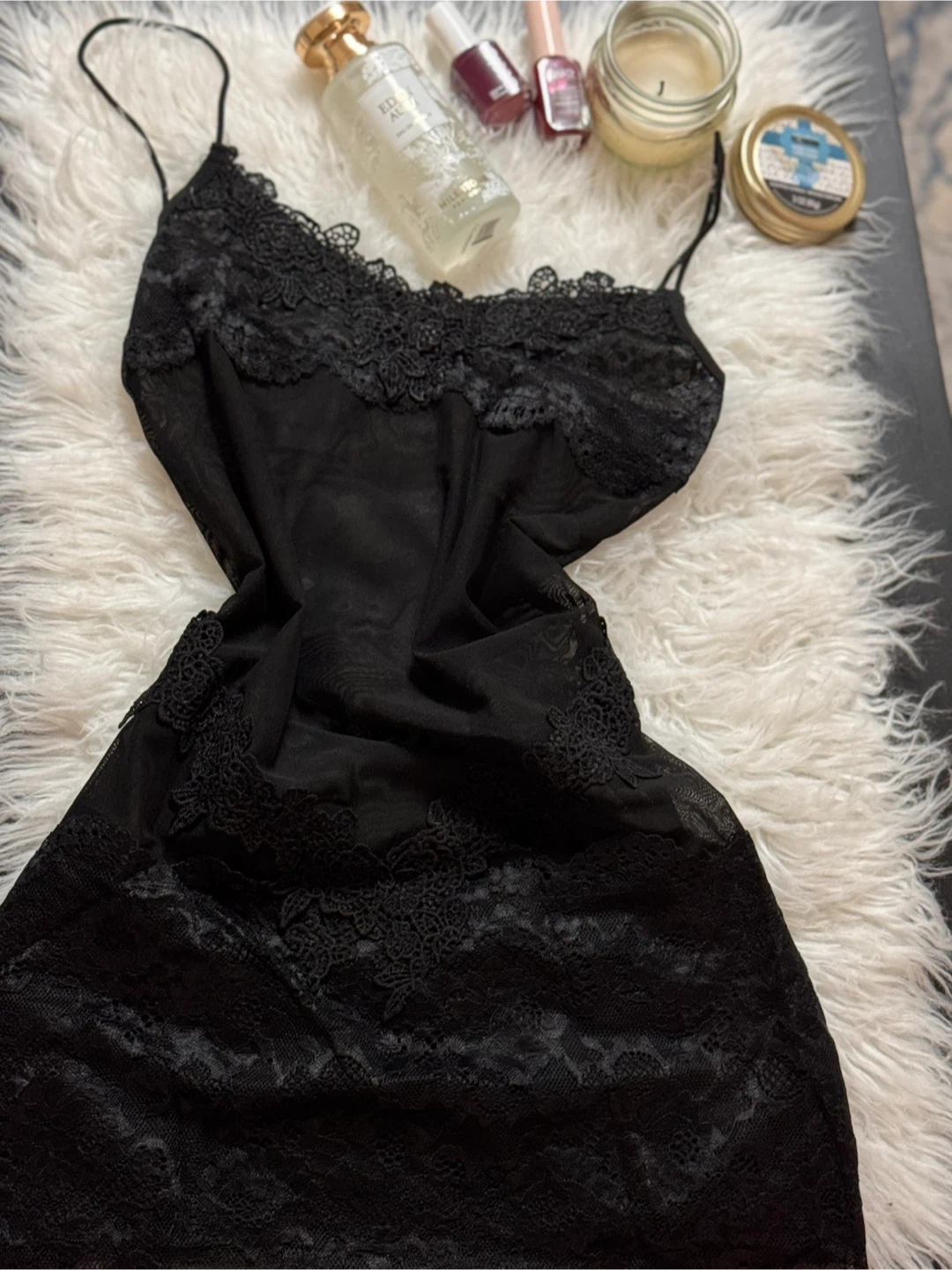 Sheer black lingerie with delicate lace trim. It features adjustable spaghetti straps for a comfortable fit. This piece is designed for a flattering silhouette.