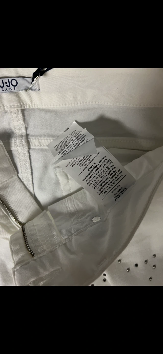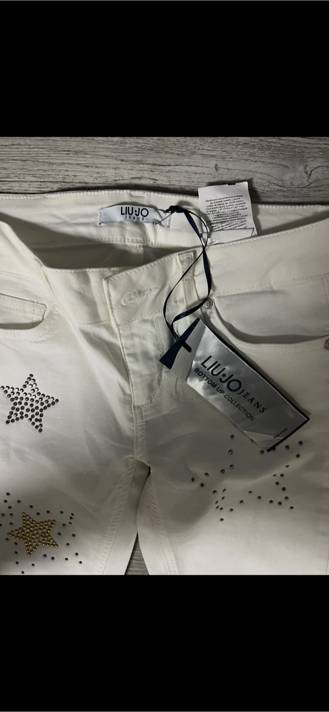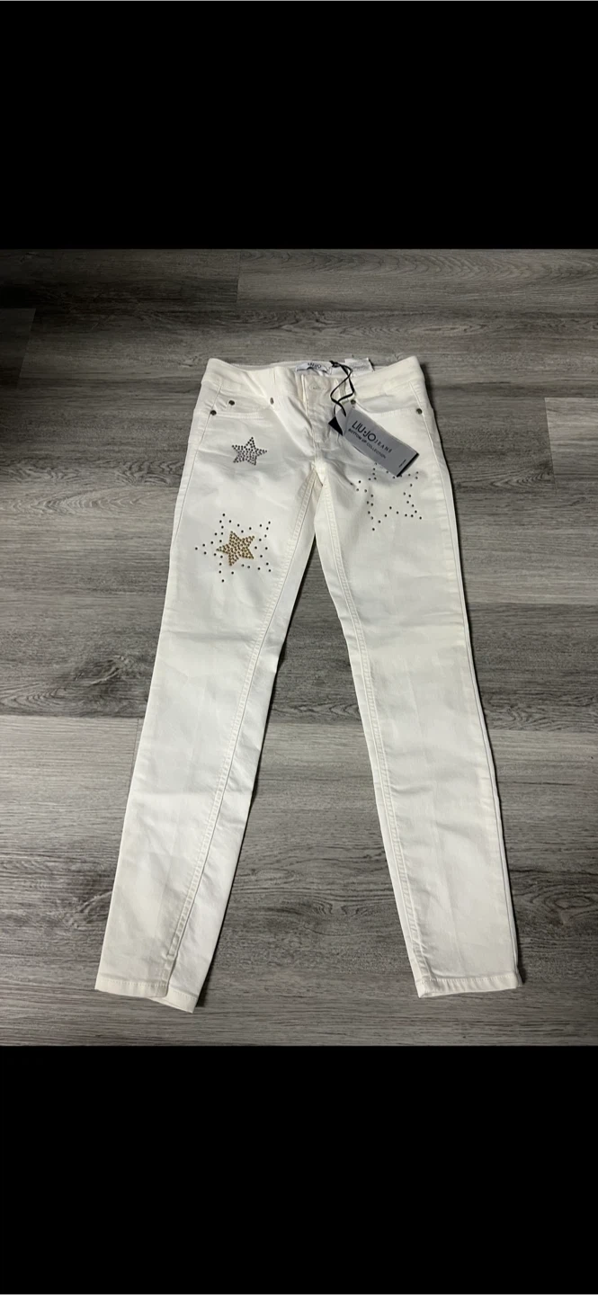 These Liu Jo Jeans are a size 27 and are white with star embellishments. They're made of denim. These jeans are a stylish addition for any wardrobe!